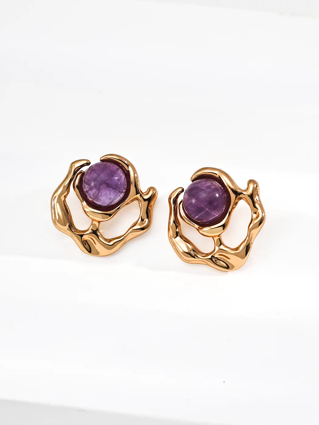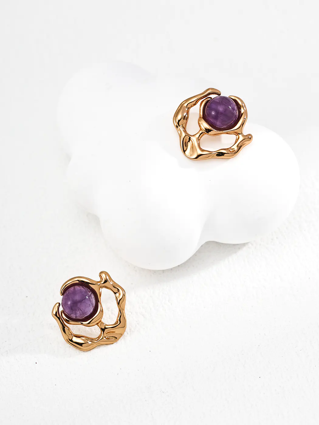 Crafted from high-quality S925 sterling silver with a vintage gold finish, these earrings ensure durability and timeless appeal. The centerpiece is a natural amethyst gemstone, known for its rich purple color and distinctive character. The smooth finish and secure stud backing provide comfortable wear throughout the day.