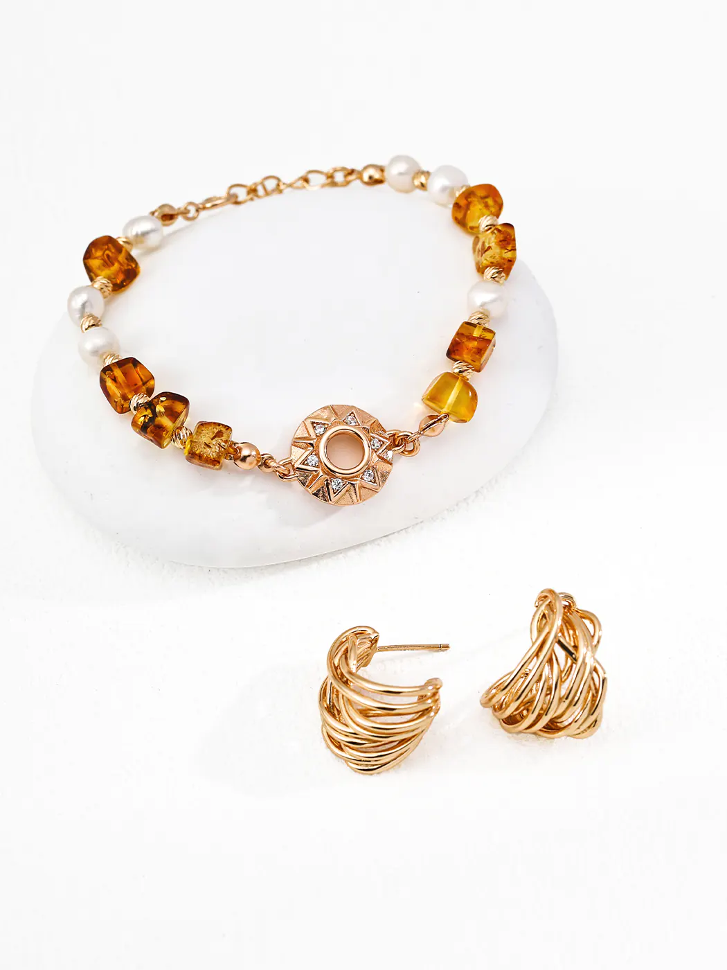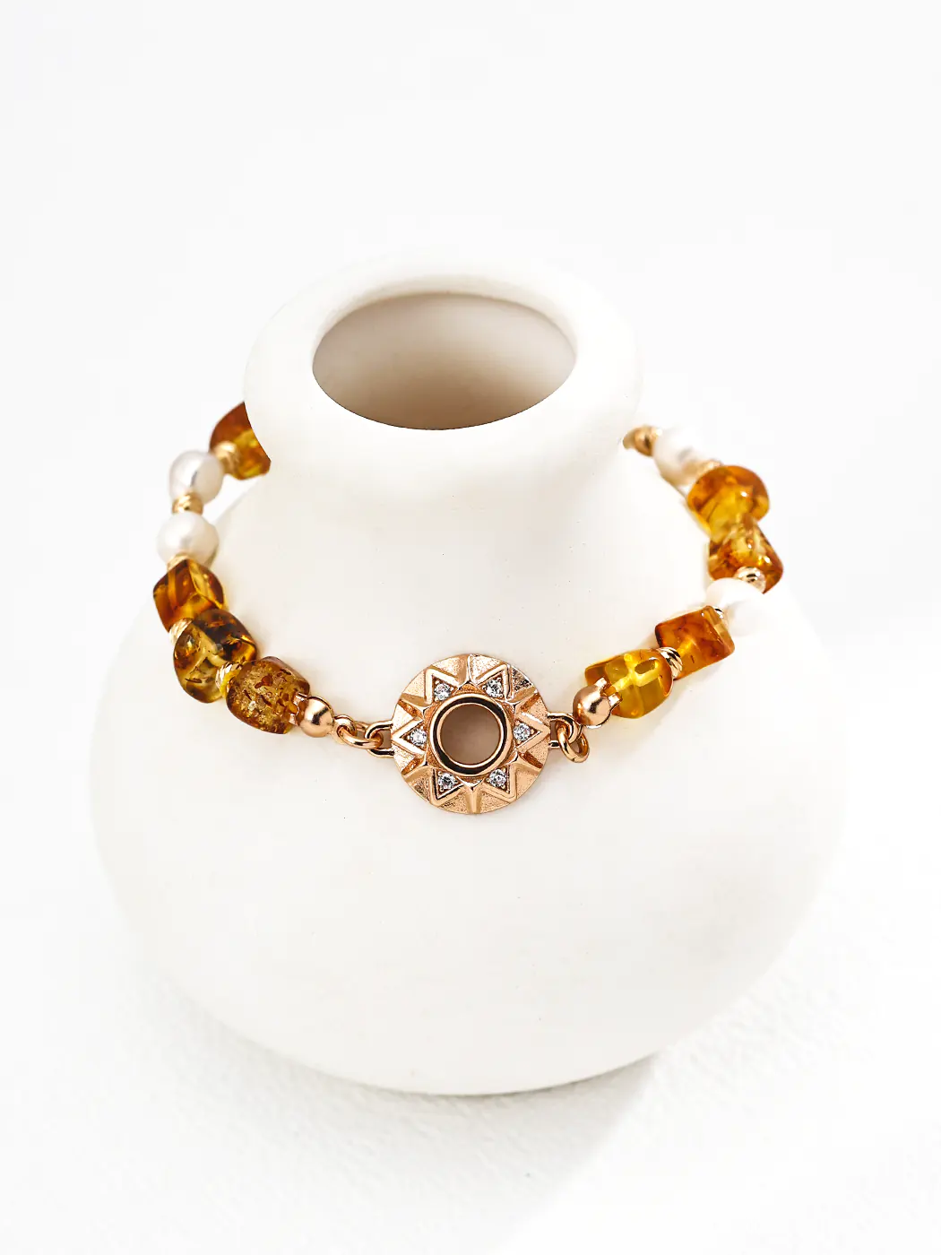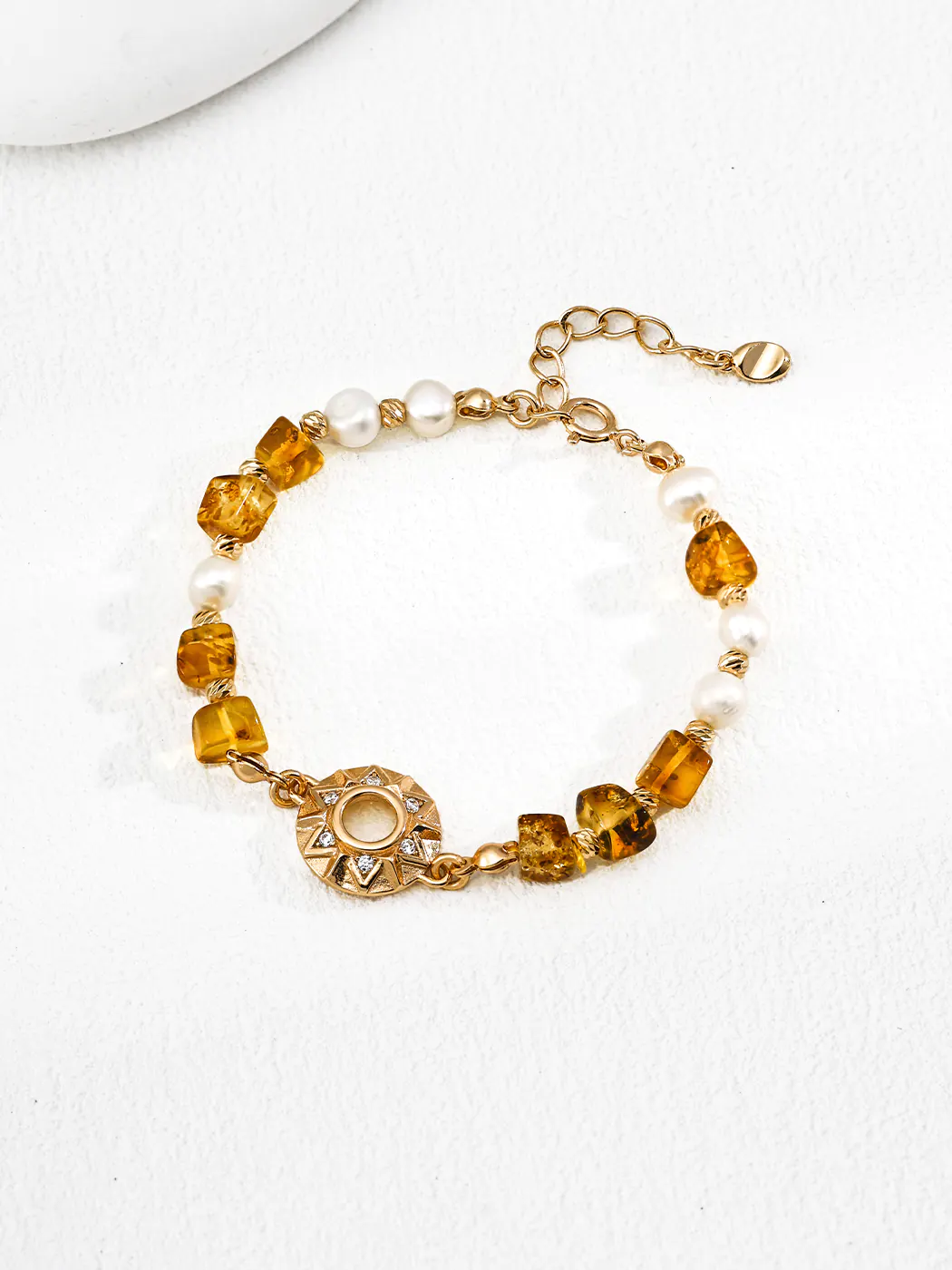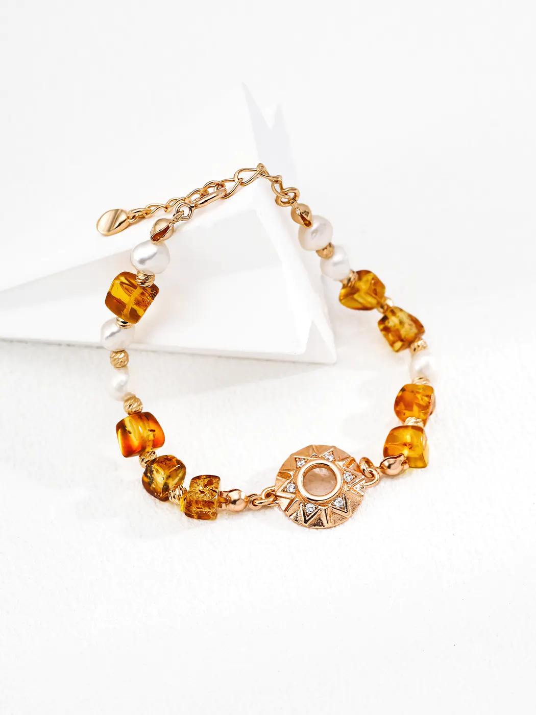 The Ancient Hexagram Amber Bracelet embodies vintage artistry with symbolic detail. Each bracelet alternates luminous 4–6 mm pearls with 6–7 mm natural amber beads, creating a warm golden glow. Moreover, a central hexagram charm sparkles with cubic zirconia, symbolizing balance and hope. Therefore, the design feels both mystical and elegant, offering beauty rooted in timeless history. In addition, the vintage gold finish enhances richness, making the amber stones shine brighter.