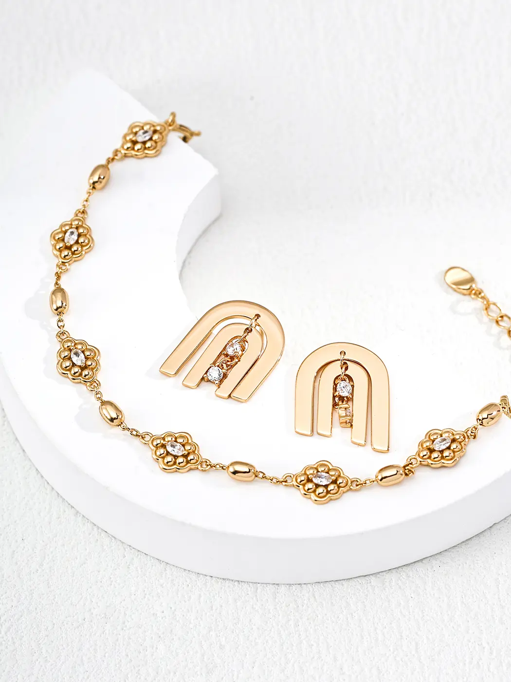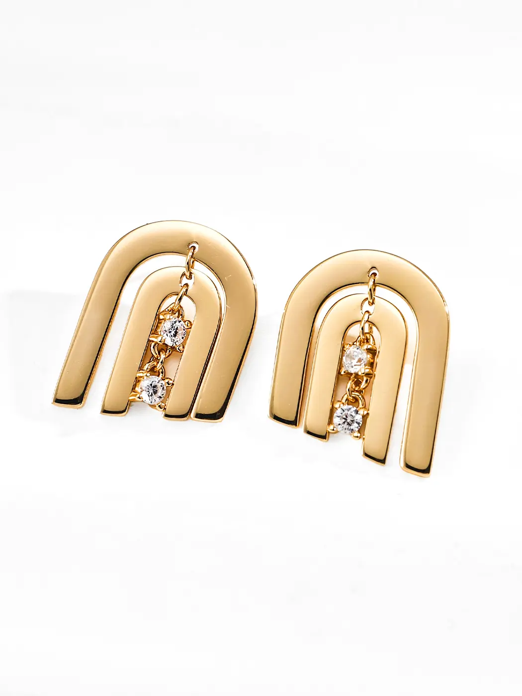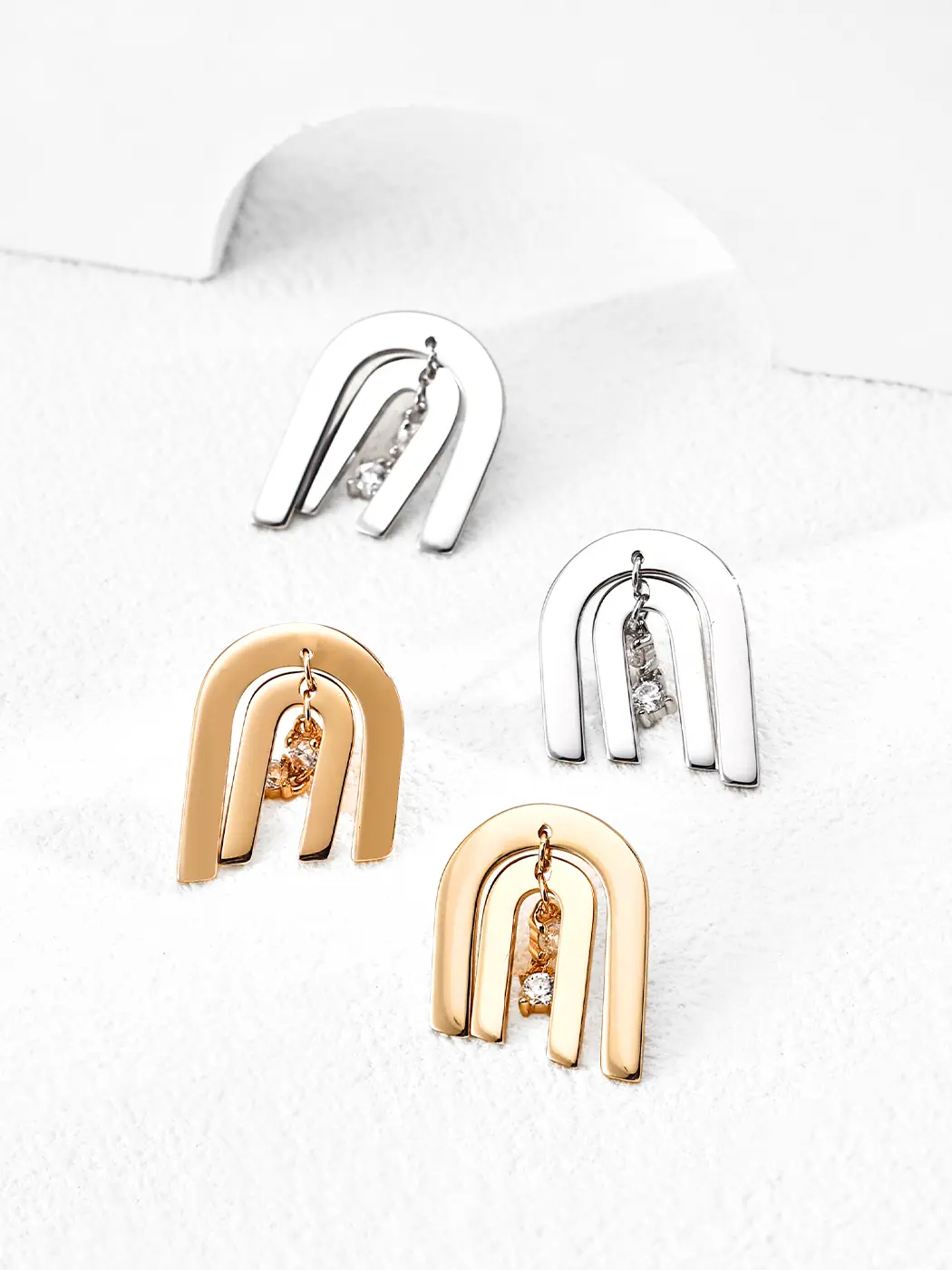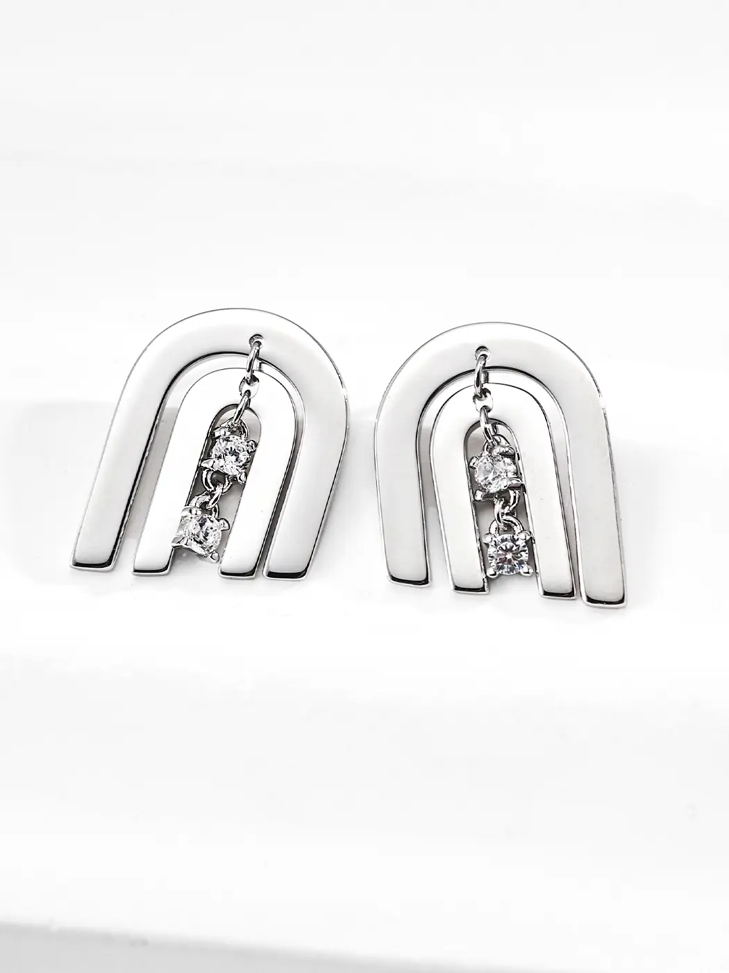 The arcs draw inspiration from modern architecture and clean structural lines. The shape reflects harmony and flow. The descending CZ stones resemble falling light or small sparks. This detail adds lively rhythm. The combination of fixed arcs and moving stones expresses contrast and unity. The earrings feel easy to style yet still carry artistic intention. The minimal structure provides clarity, while the moving stones add emotion. The result remains contemporary and expressive without excess detail.