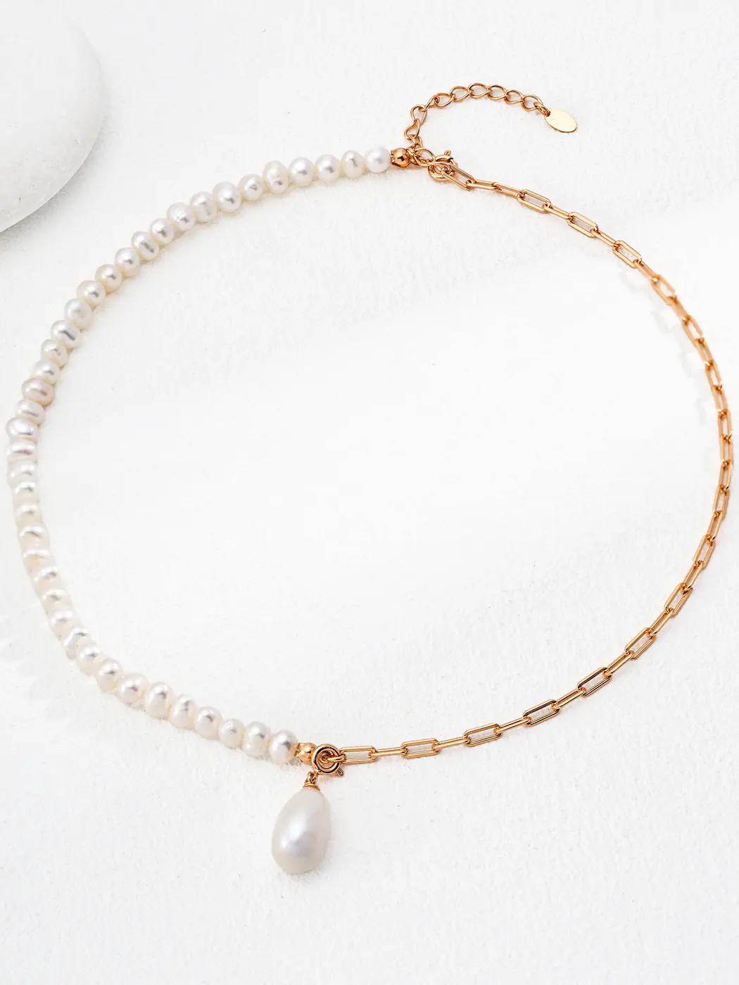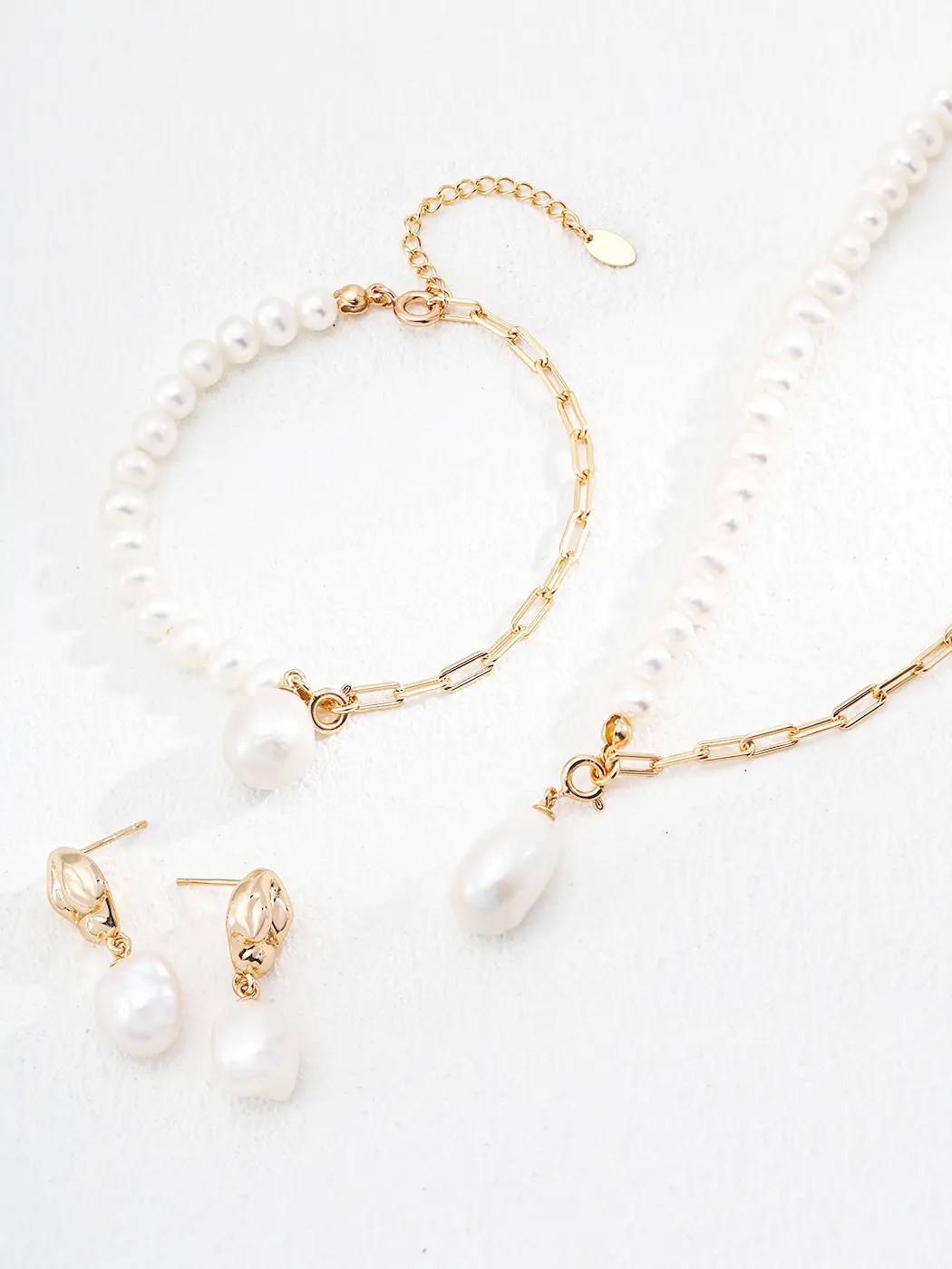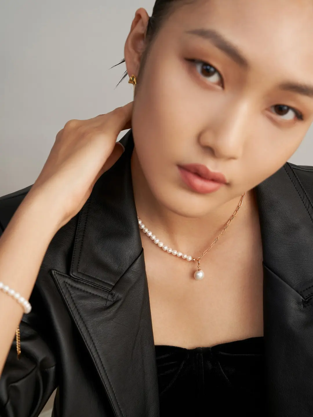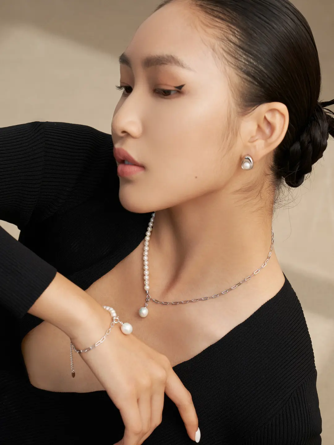 The Atelier Baroque Pearl Necklace blends vintage charm with clean modern lines. One side uses a strand of small, round pearls. The other side shows a sleek paper-clip chain in warm gold. A teardrop baroque pearl hangs at the meeting point. The contrast feels fresh, poetic, and unmistakably chic. Moreover, the asymmetric balance frames the neckline with effortless grace. As a result, the piece looks light, refined, and ready for daily wear.