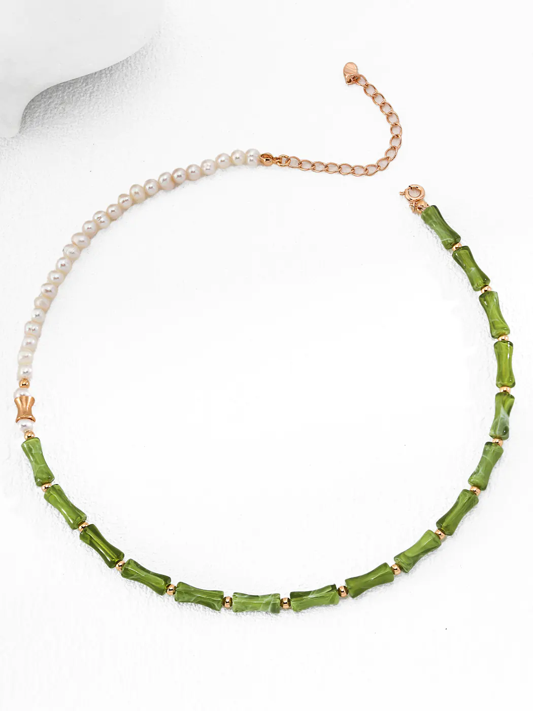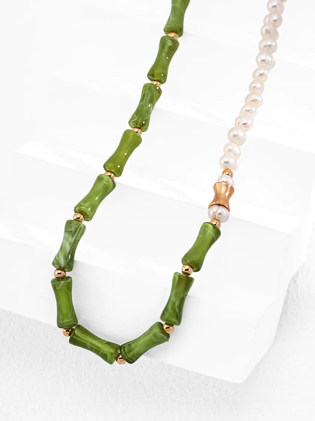 The bamboo pearl choker presents a striking blend of nature and artistry. One half features glowing white pearls with a smooth, refined surface. Meanwhile, the other half uses green resin beads shaped like bamboo, accented with golden spacers. Therefore, the overall design feels bold, elegant, and full of contrast. Moreover, the balance of colors adds both vitality and grace.