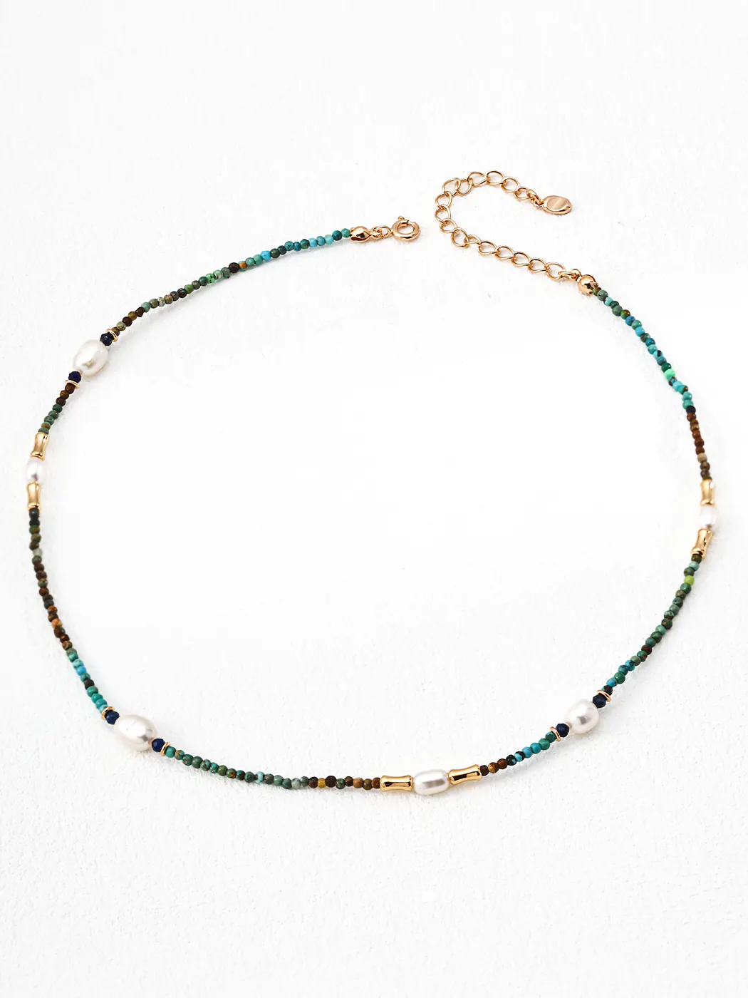 The necklace is crafted from S925 sterling silver with vintage gold plating for durability and warmth. Furthermore, it combines three natural elements: turquoise beads for vivid blue-green hues, lapis beads for deep midnight tones, and freshwater pearls for luminous elegance. In addition, the chain measures 38 cm with a 6 cm extender, ensuring a comfortable and adjustable fit. Consequently, the piece balances quality craftsmanship with stylish flexibility.