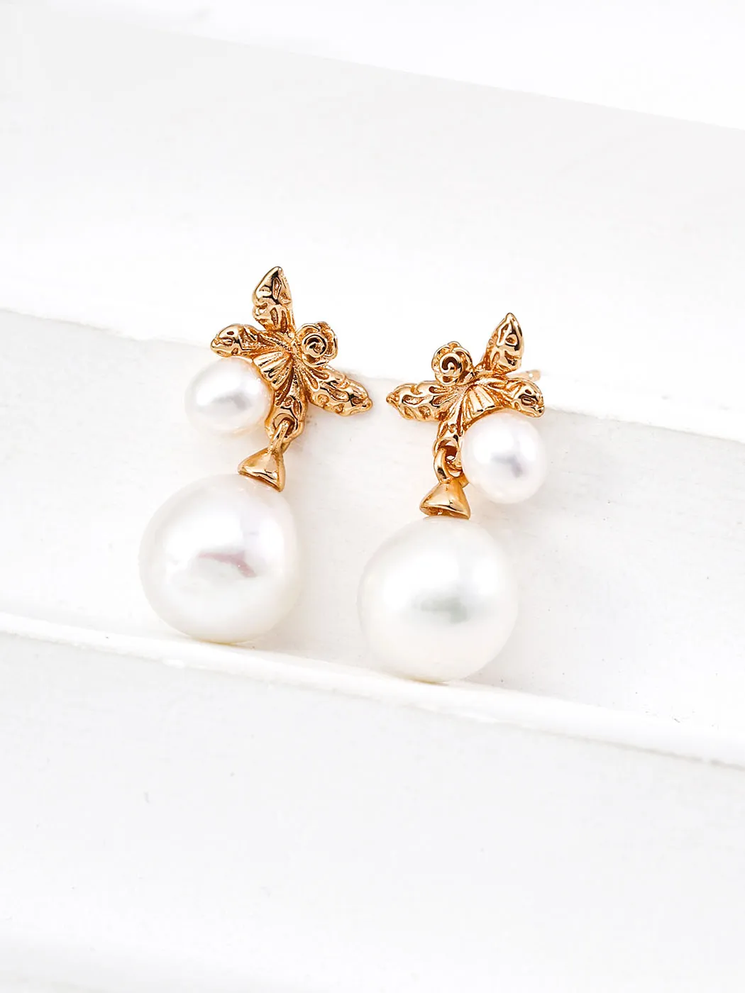 These Butterfly Dew Pearl Drops embody grace and natural beauty. Each earring features a sculptural butterfly in vintage gold, detailed with delicate wings and textured lines. Below, two luminous natural pearls dangle elegantly—one measuring 11 mm, the other about 5 mm. As a result, the earrings resemble morning dew resting on butterfly wings. Moreover, their 2.5 cm length ensures presence without being overwhelming, making them perfect for both daily wear and special occasions.