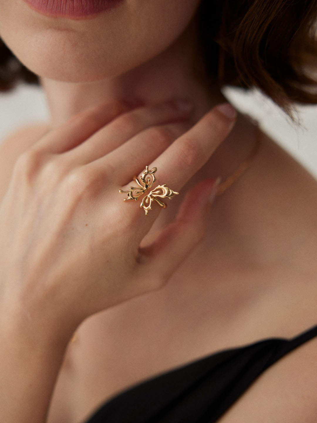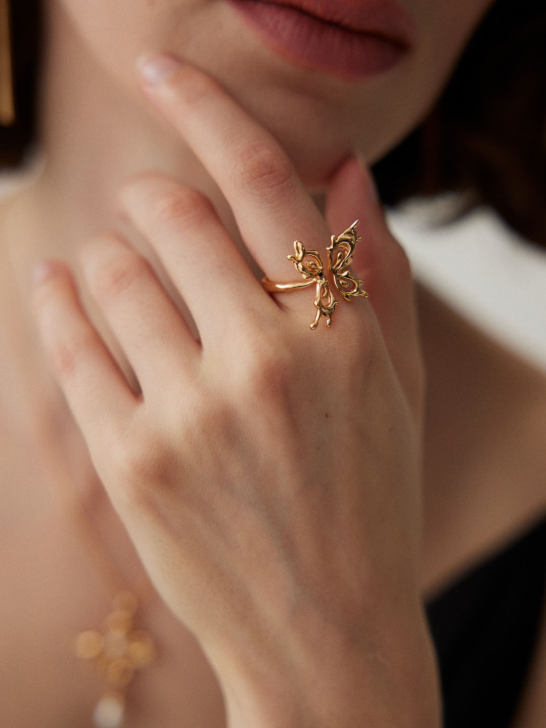 Pair it with light, flowing fabrics for a soft, romantic look. On the other hand, wear it with minimalist outfits to let the butterfly details shine as the focal point. Moreover, it layers beautifully with slim silver bands or gemstone rings for a curated, chic stack.