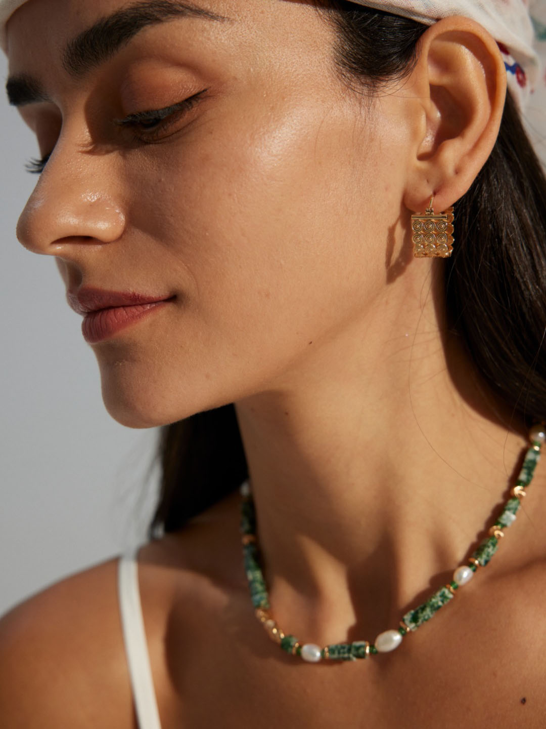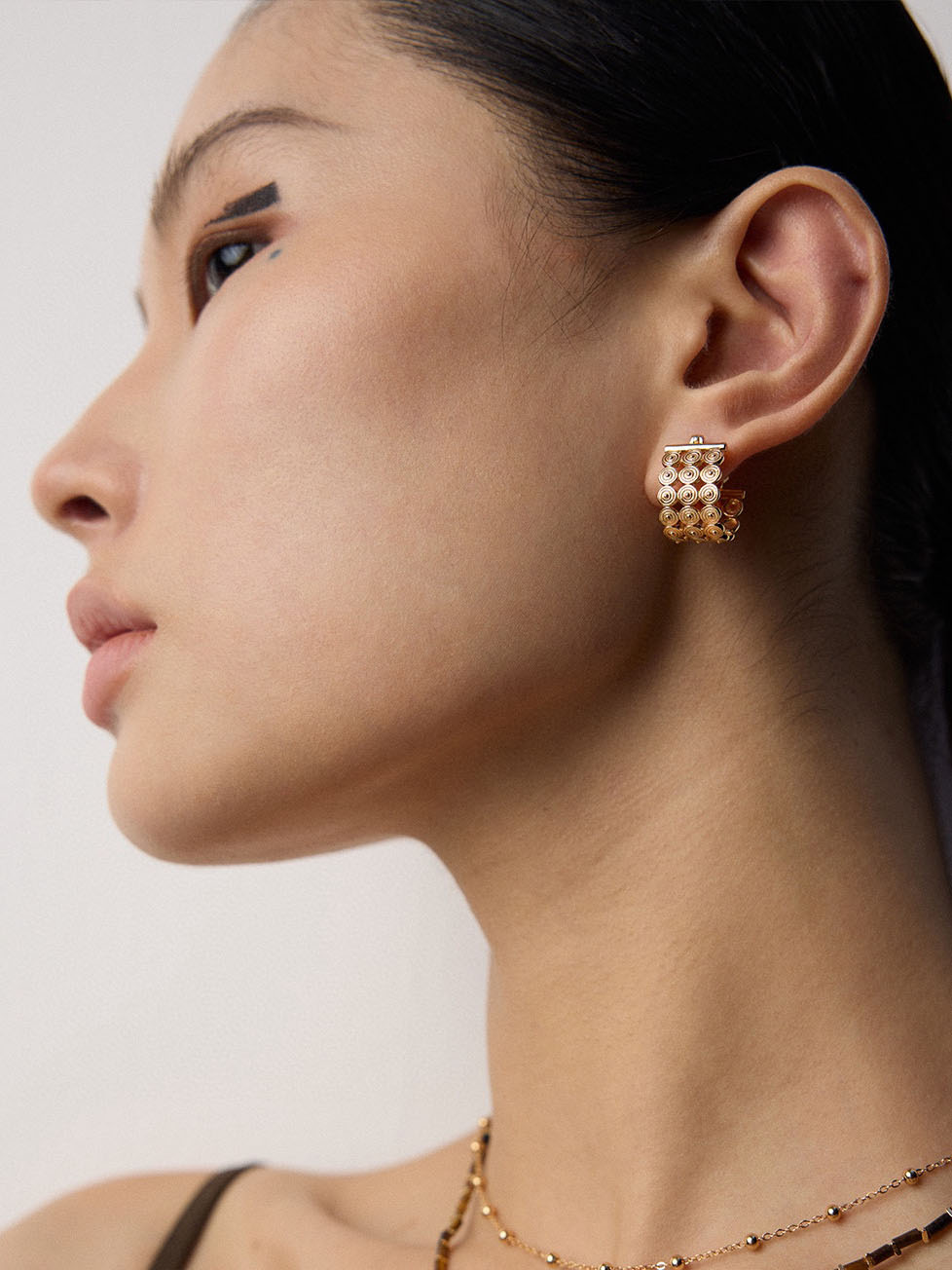 The mosaic design echoes Byzantine art, renowned for its intricate patterns and symbolic beauty. Each circular form represents continuity and unity, linking history with modern fashion. Moreover, the huggie style provides ease of wear, offering both security and elegance.