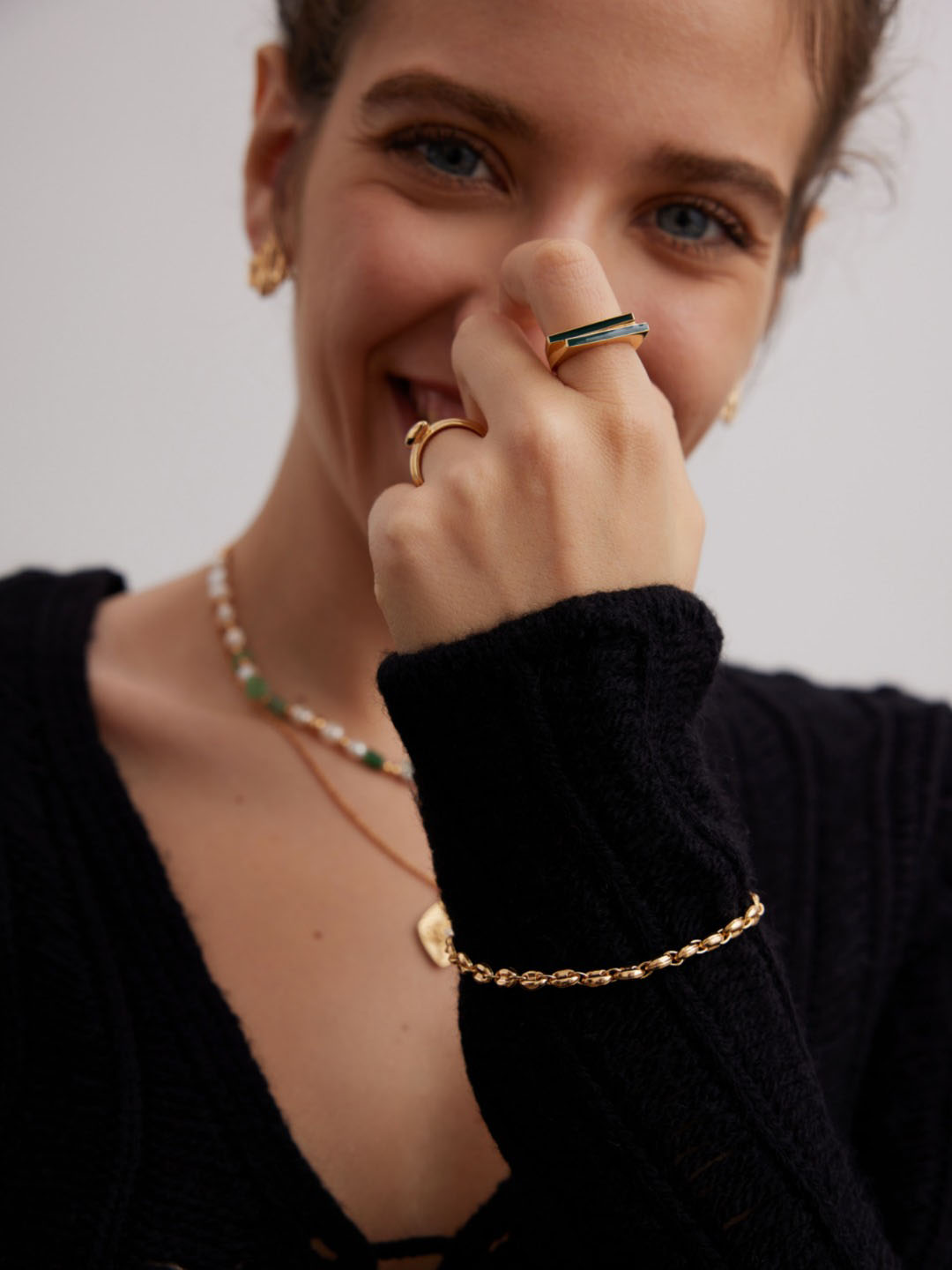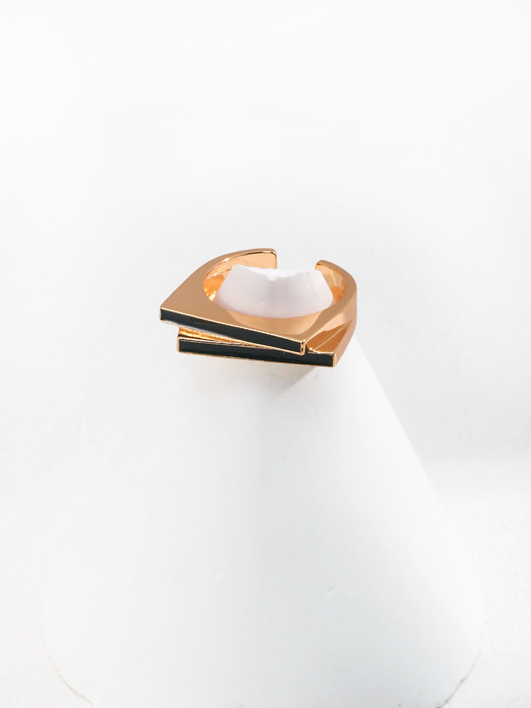 This cascade bars ring delivers a sleek and modern aesthetic. The band, measuring 5 mm in width, features layered bar elements coated in glossy black enamel. These geometric bars form a bold yet minimalist profile that looks striking from every angle. Moreover, the vintage gold finish adds warmth, creating balance between sharp modern lines and timeless elegance. As a result, the cascade bars ring becomes a versatile accessory that complements both casual and formal looks.