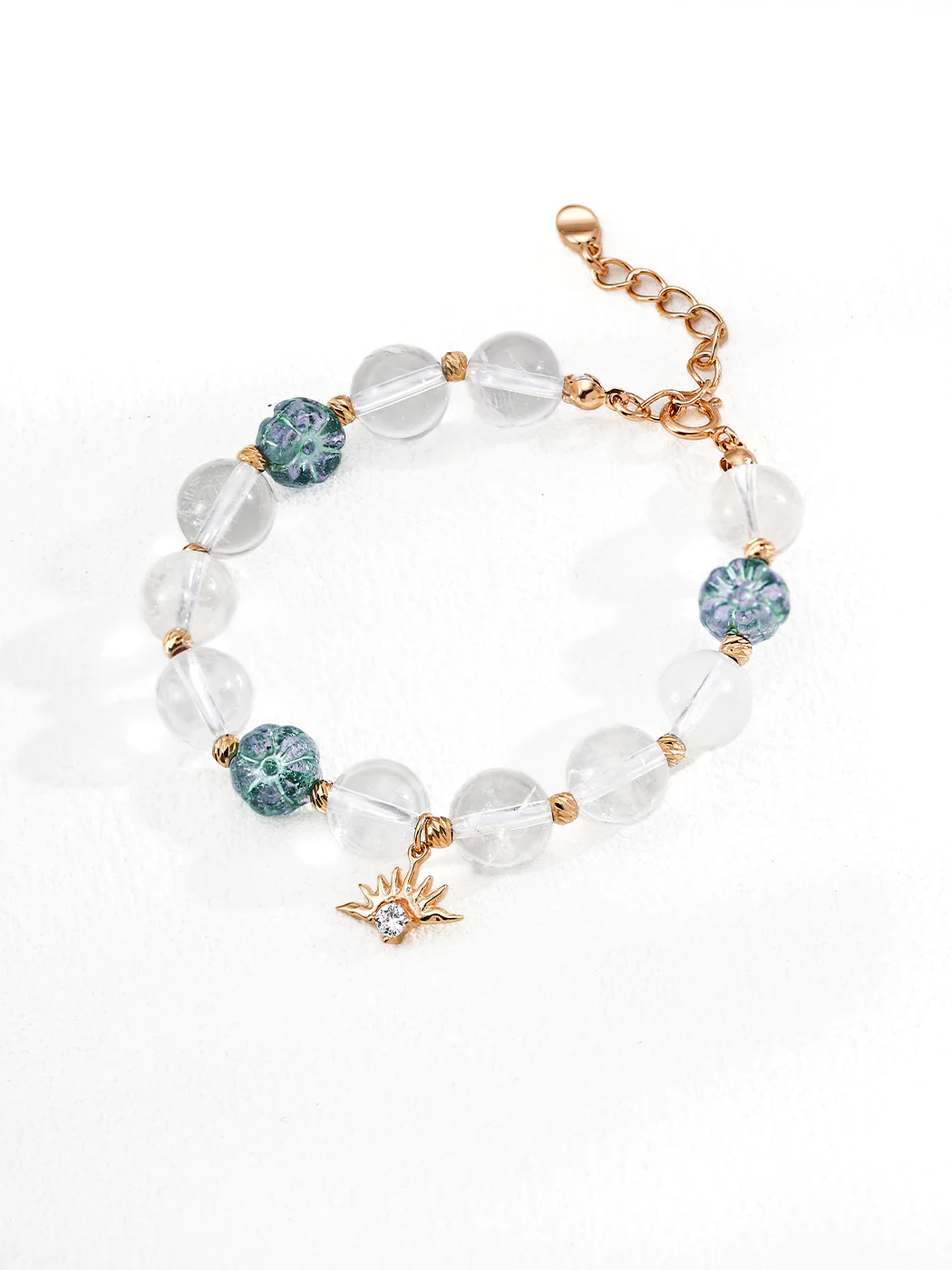 This clear glass bead bracelet features a harmonious mix of translucent white crystal beads, floral-patterned glass beads, and a radiant zircon charm. The round 9 mm beads create a luminous rhythm, reflecting light with every movement. A delicate sunburst charm adorned with sparkling zircon adds a modern and artistic finish.