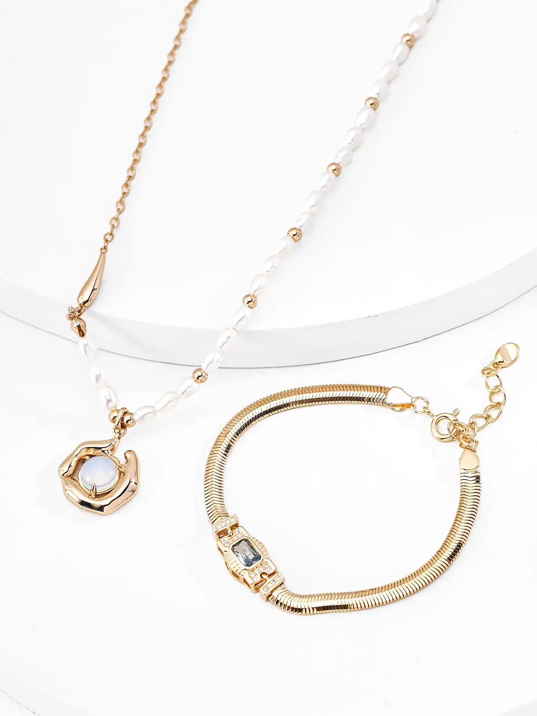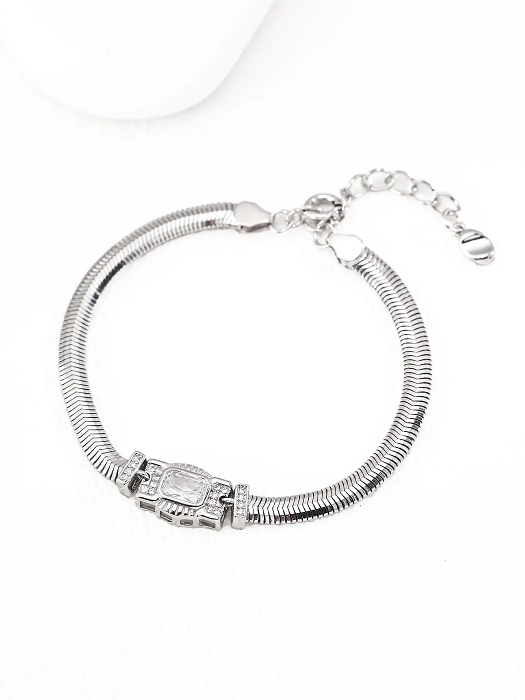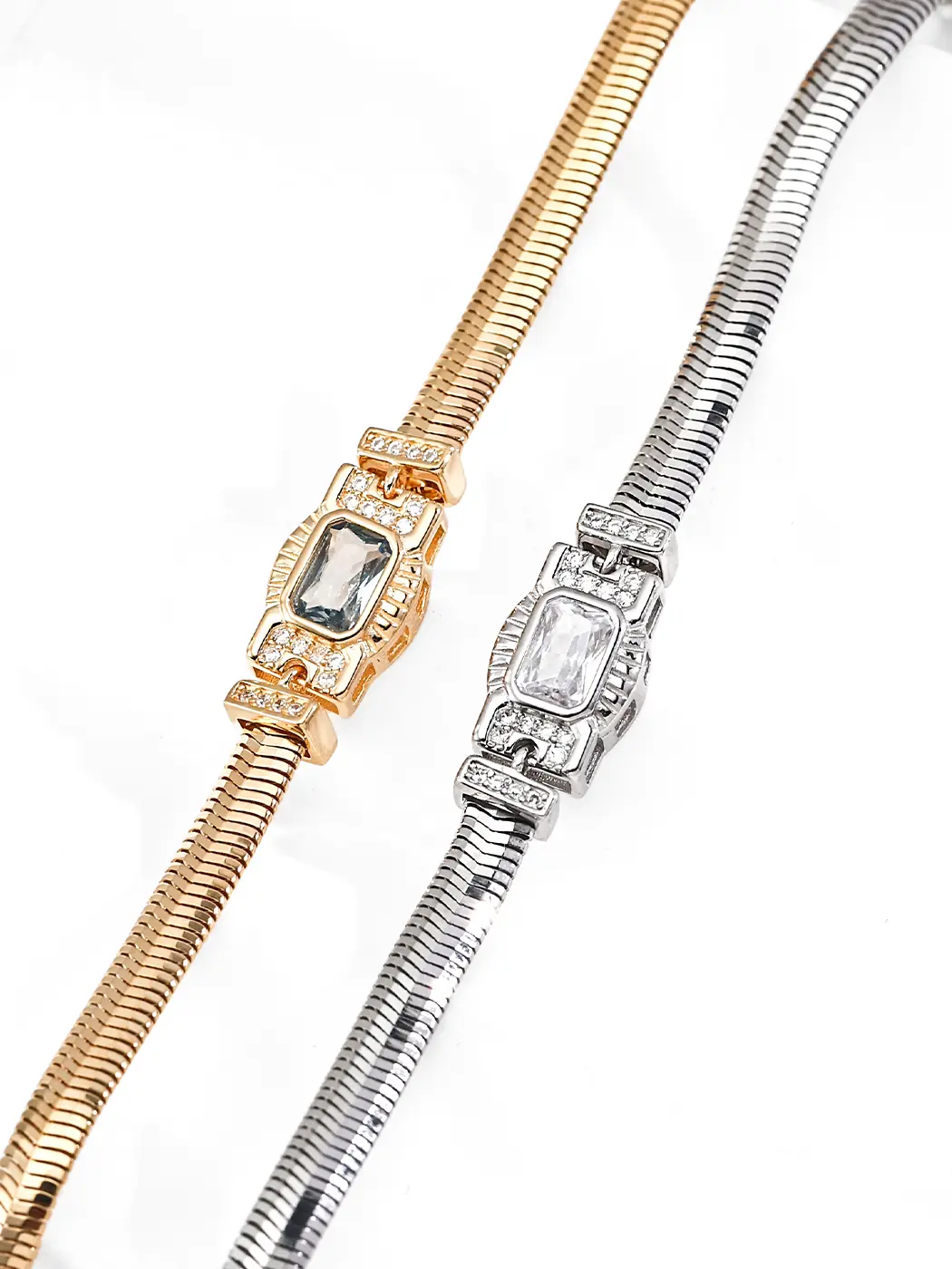 This bracelet adds strong lines to soft outfits and works well with fitted tops, blazers, and button-downs. It pairs beautifully with gold chains, thin cuffs, and simple rings for a layered look. Because the shape carries clean edges, it enhances monochrome outfits or tailored sets. For evening styling, the bright stones complement satin dresses, dark suits, or metallic accessories. The bracelet also pairs effortlessly with structured handbags and minimalist earrings for a polished, modern appearance.
