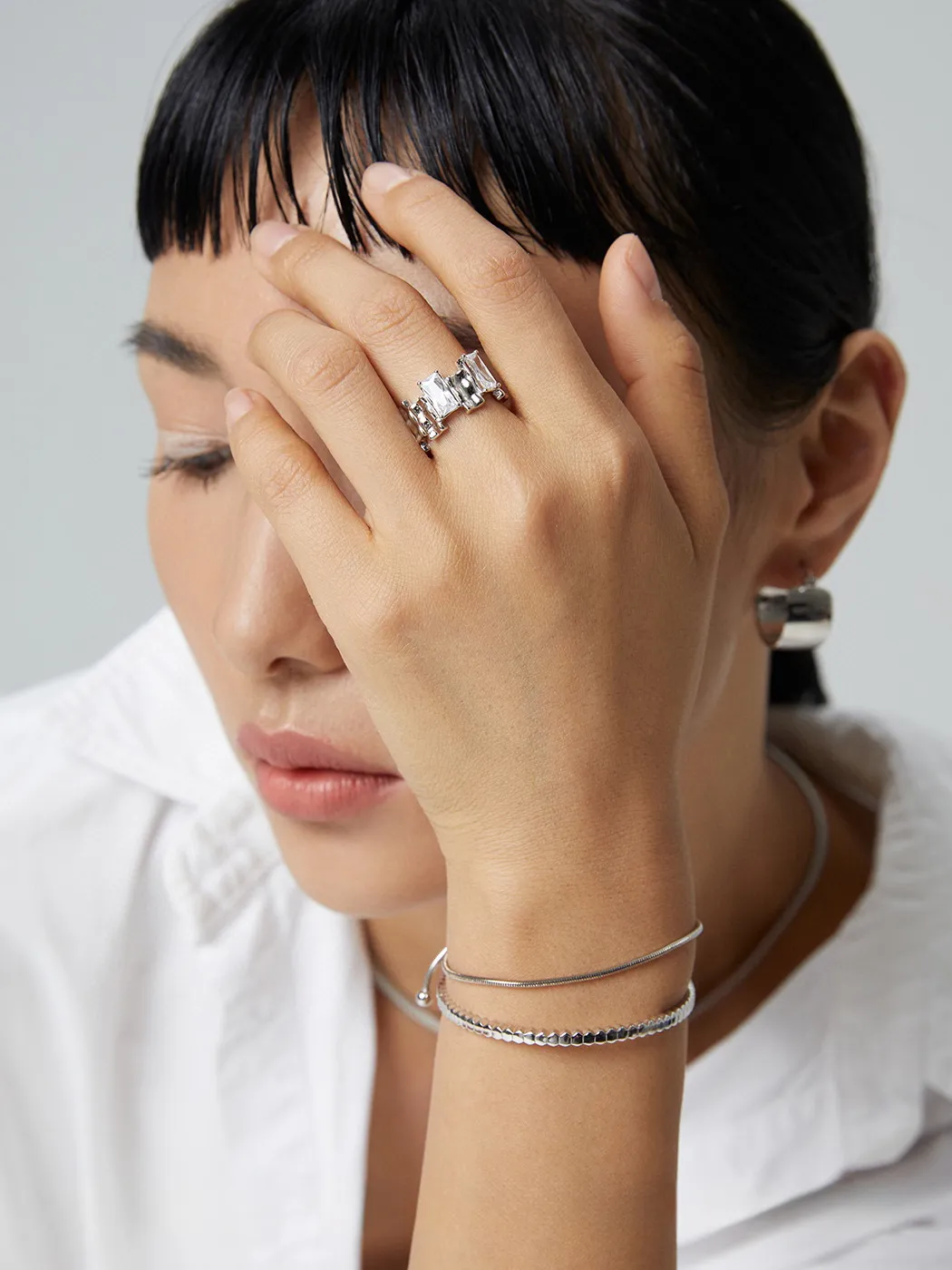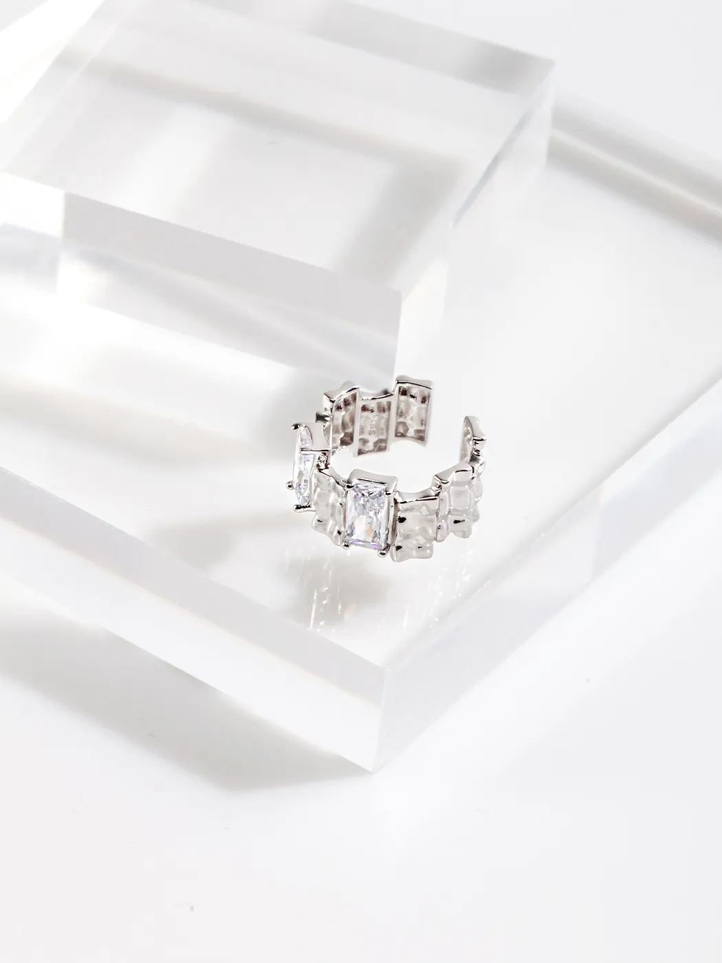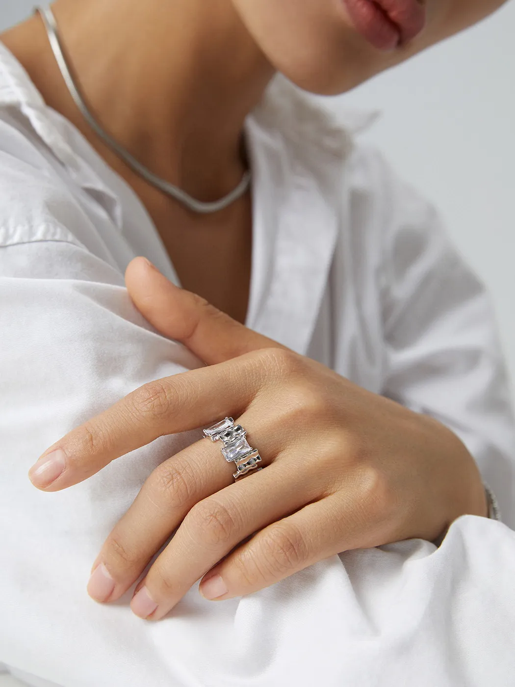 Crafted from premium S925 sterling silver, the rings are available in silver and gold-plated finishes. The baguette zircon stones are cut for maximum brilliance, reflecting light with every movement. The band’s wide profile ensures a bold presence, while the open adjustable design provides a comfortable fit for sizes approximately 10 to 15.