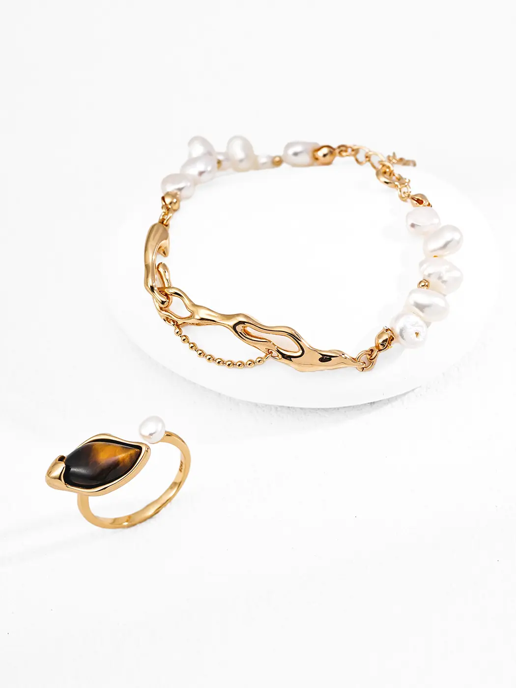 This ring uses S925 sterling silver plated with 18K gold to create a warm, rich finish. The tiger eye stone displays golden-brown layers that change with the light. Natural pearl adds softness, and its gentle luster enhances the overall balance. You adjust the ring easily because the open design offers flexibility. Although the structure looks delicate, it still feels sturdy for everyday usage. Additionally, the polished surface creates a smooth, comfortable fit.