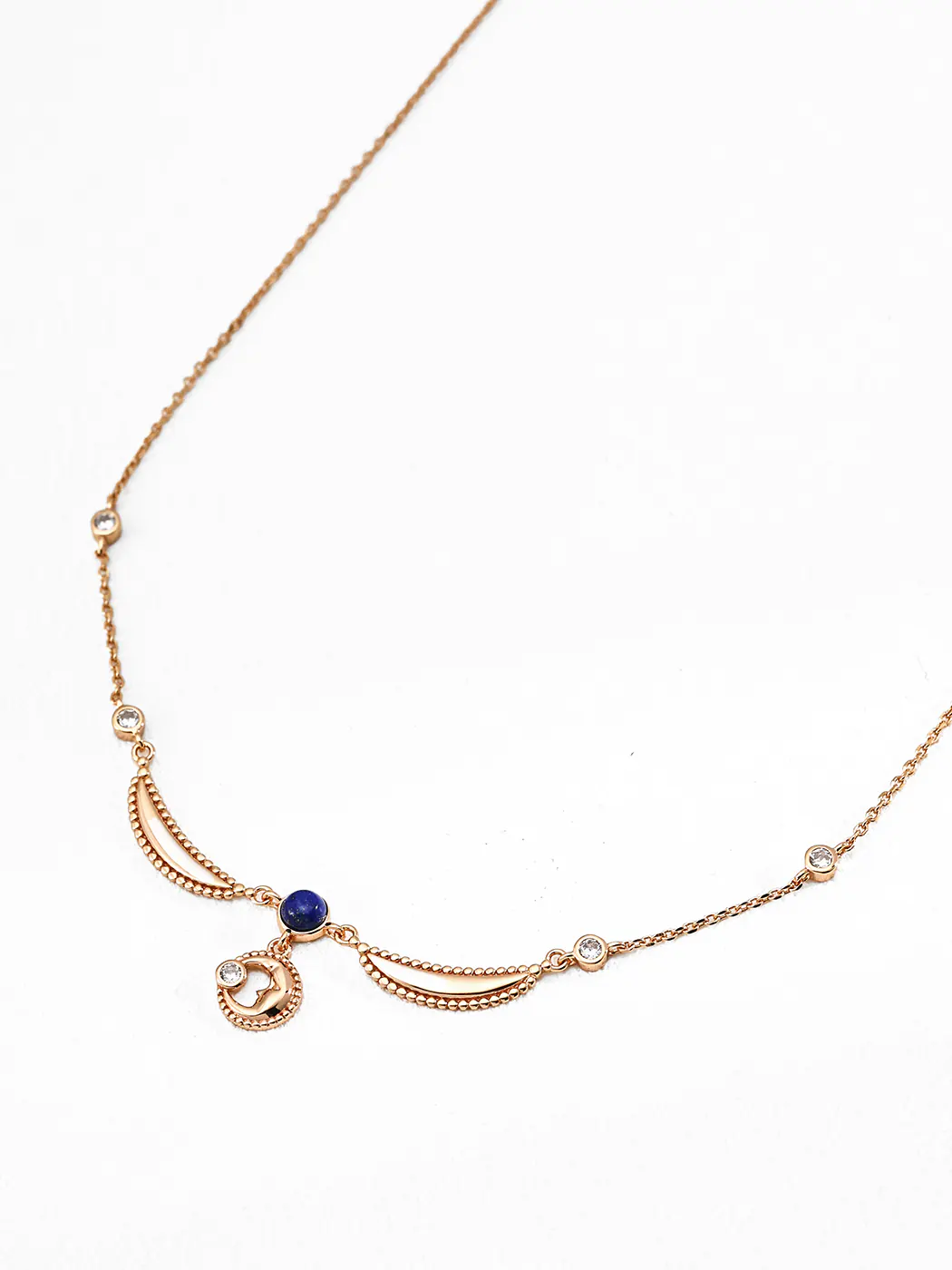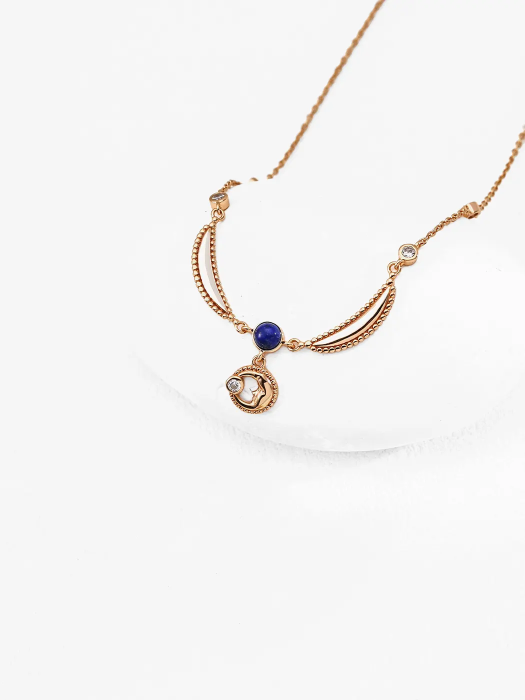 This necklace is crafted from genuine 925 sterling silver with a vintage-gold plating. In addition, it showcases a natural lapis lazuli gemstone, valued for its intense blue tone and unique specks of gold. Zircon accents complete the look, offering brilliance without overwhelming the design. Furthermore, the adjustable extender ensures a secure and flexible fit for various styles. Therefore, this necklace balances durability, luxury, and celestial symbolism.
