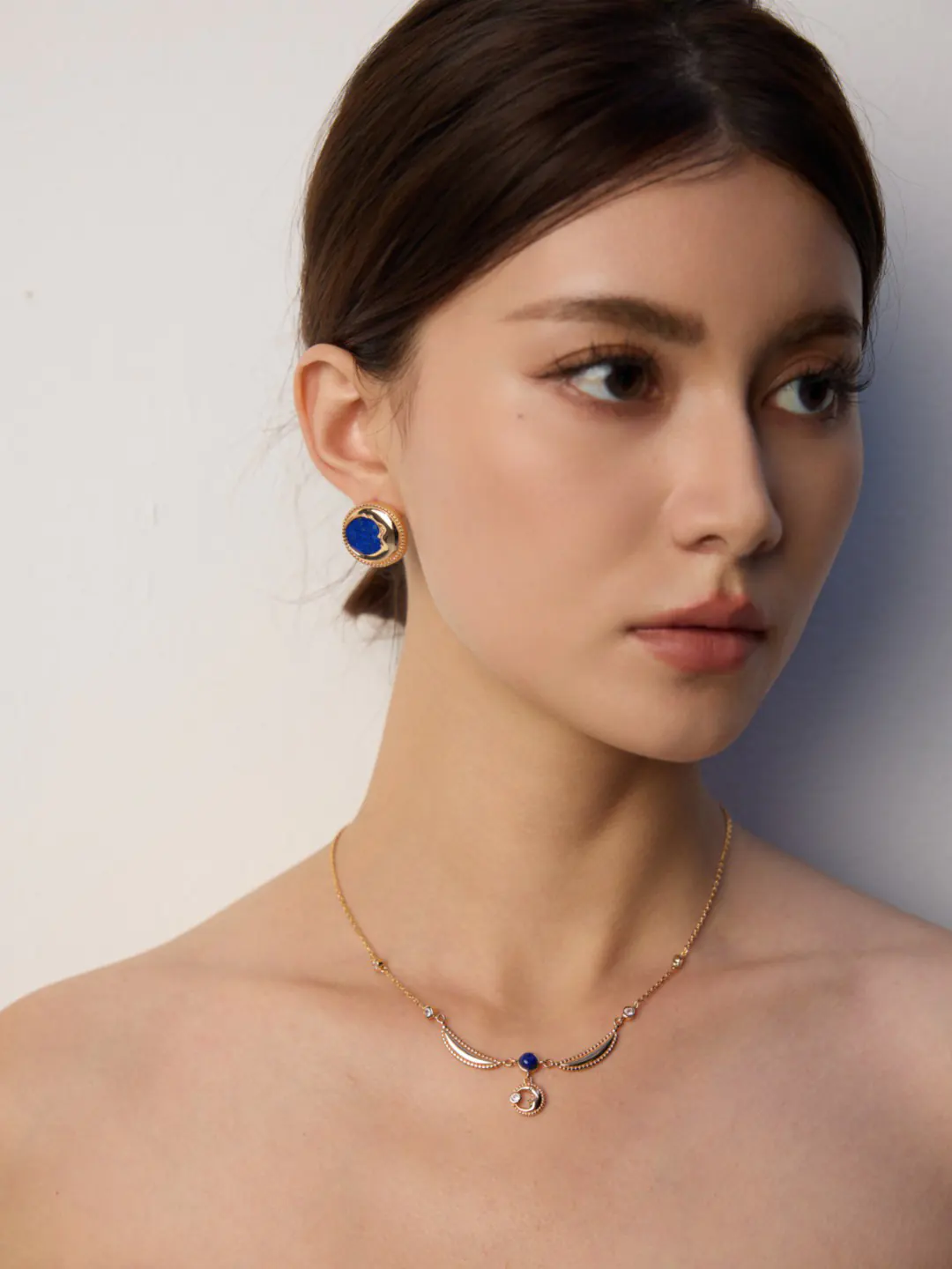 This necklace adapts seamlessly to diverse looks. For example, pair it with casual linen tops or dresses to add a touch of mystique. Moreover, it enhances professional outfits, complementing structured blazers with subtle cosmic elegance. In evening settings, its deep-blue gemstone and golden tones shine against velvet or silk. Furthermore, it layers well with minimalist chains or moon-themed jewelry for a curated celestial stack. Consequently, this necklace transitions effortlessly from day to night.