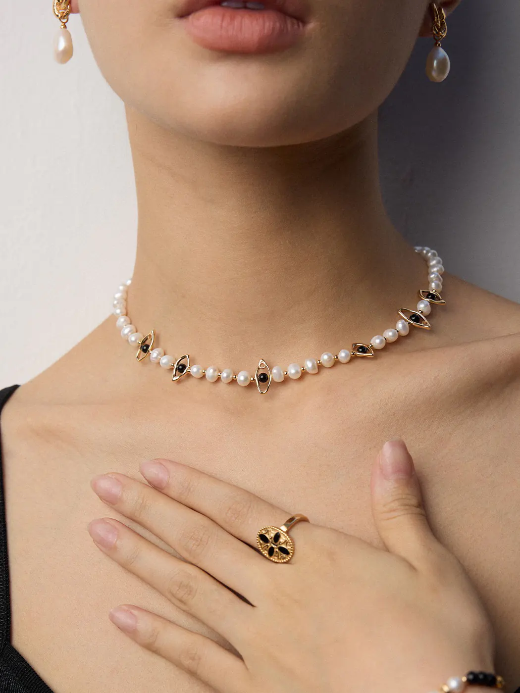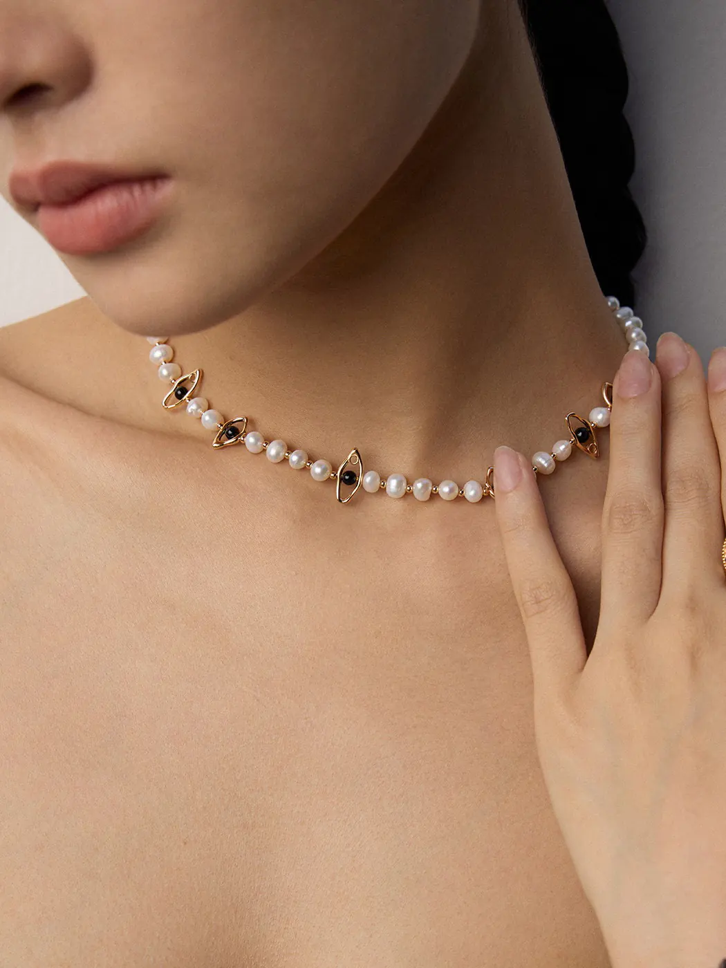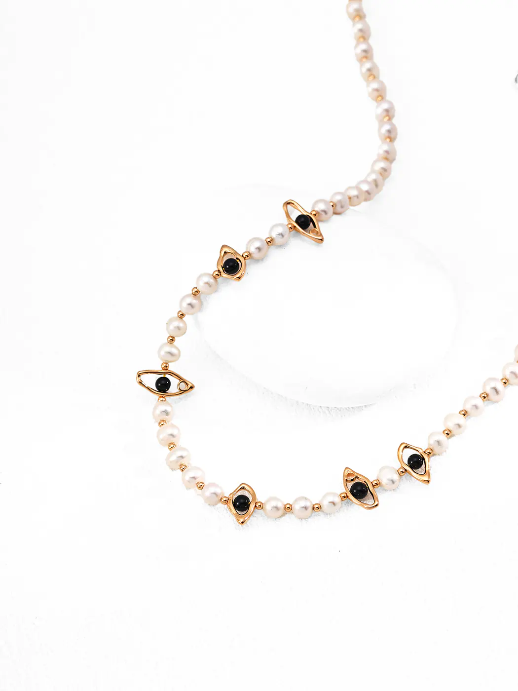 Evil Eye Pearl Necklace with Black Onyx and GoldEvil Eye Pearl Necklace with Black Onyx and Gold