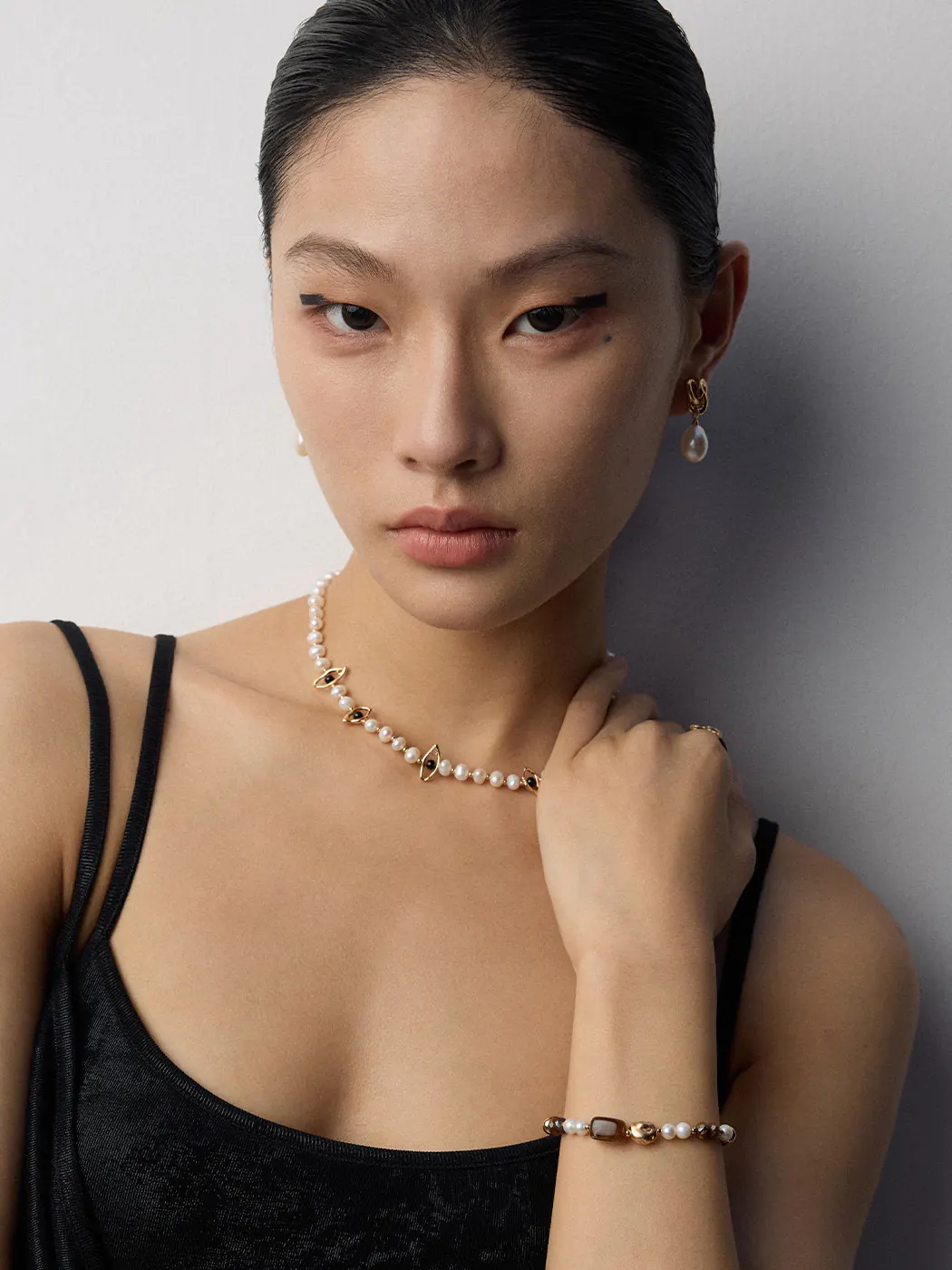 The Evil Eye Pearl Necklace showcases a striking balance of elegance and symbolism. Smooth freshwater pearls line the chain, glowing with gentle luster. Moreover, vintage-gold beads enhance the rhythm of the design. Between the pearls, eye-shaped frames hold polished black onyx stones, symbolizing protection and mystery. In addition, the geometric gold outlines create a refined contrast against the pearls’ soft sheen, giving the necklace a bold yet graceful character.