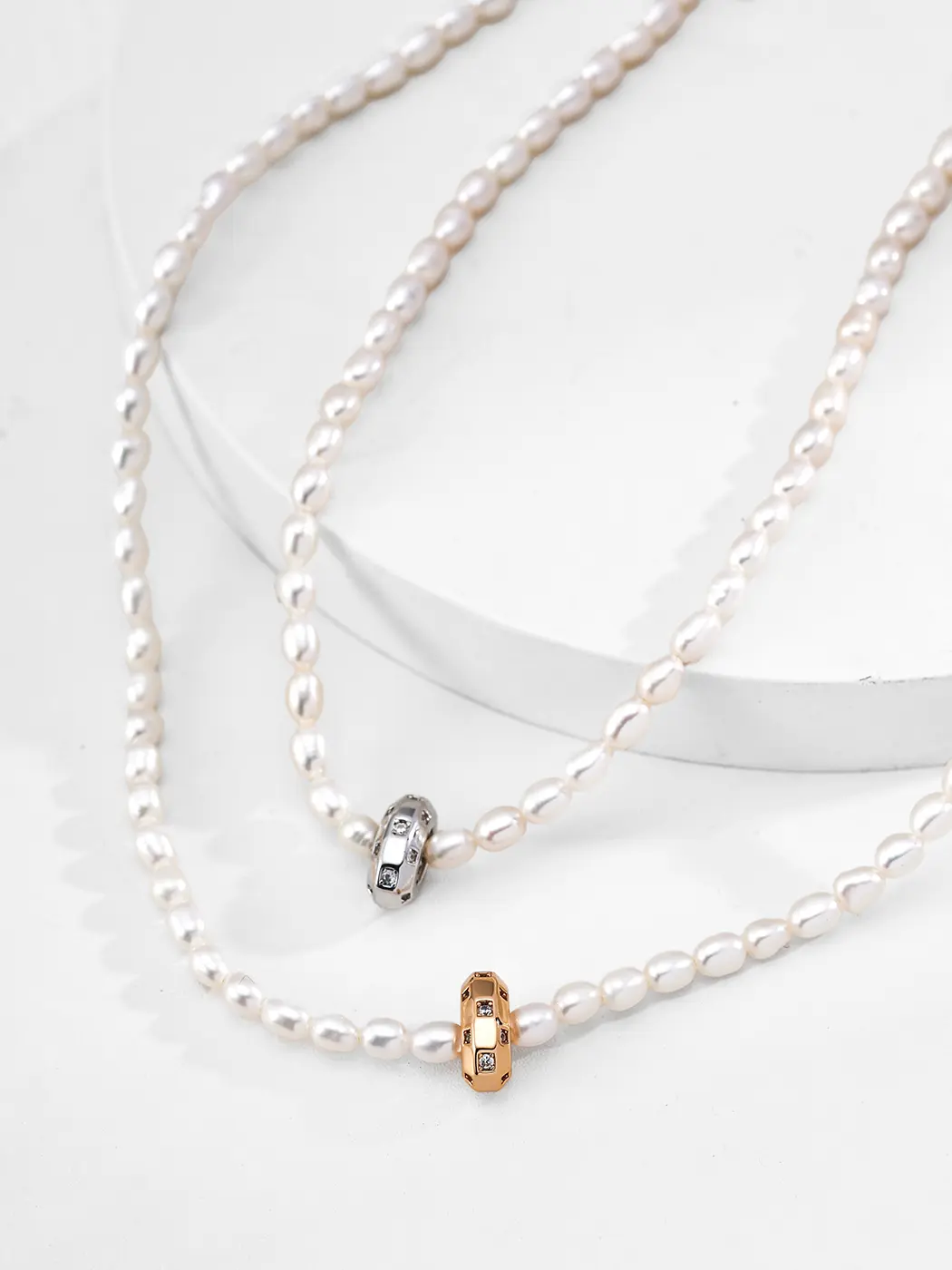 The Facet Loop Necklace centers on a sculptural loop pendant with crisp, geometric edges and a refined shine. At first glance, the design feels modern and architectural. The clean lines contrast beautifully with the soft rhythm of pearls along the chain. As a result, the necklace delivers a balanced look that feels both futuristic and elegant. Moreover, the faceted surface reflects light from multiple angles, creating a subtle yet eye-catching glow. This contrast gives the piece a confident visual identity.