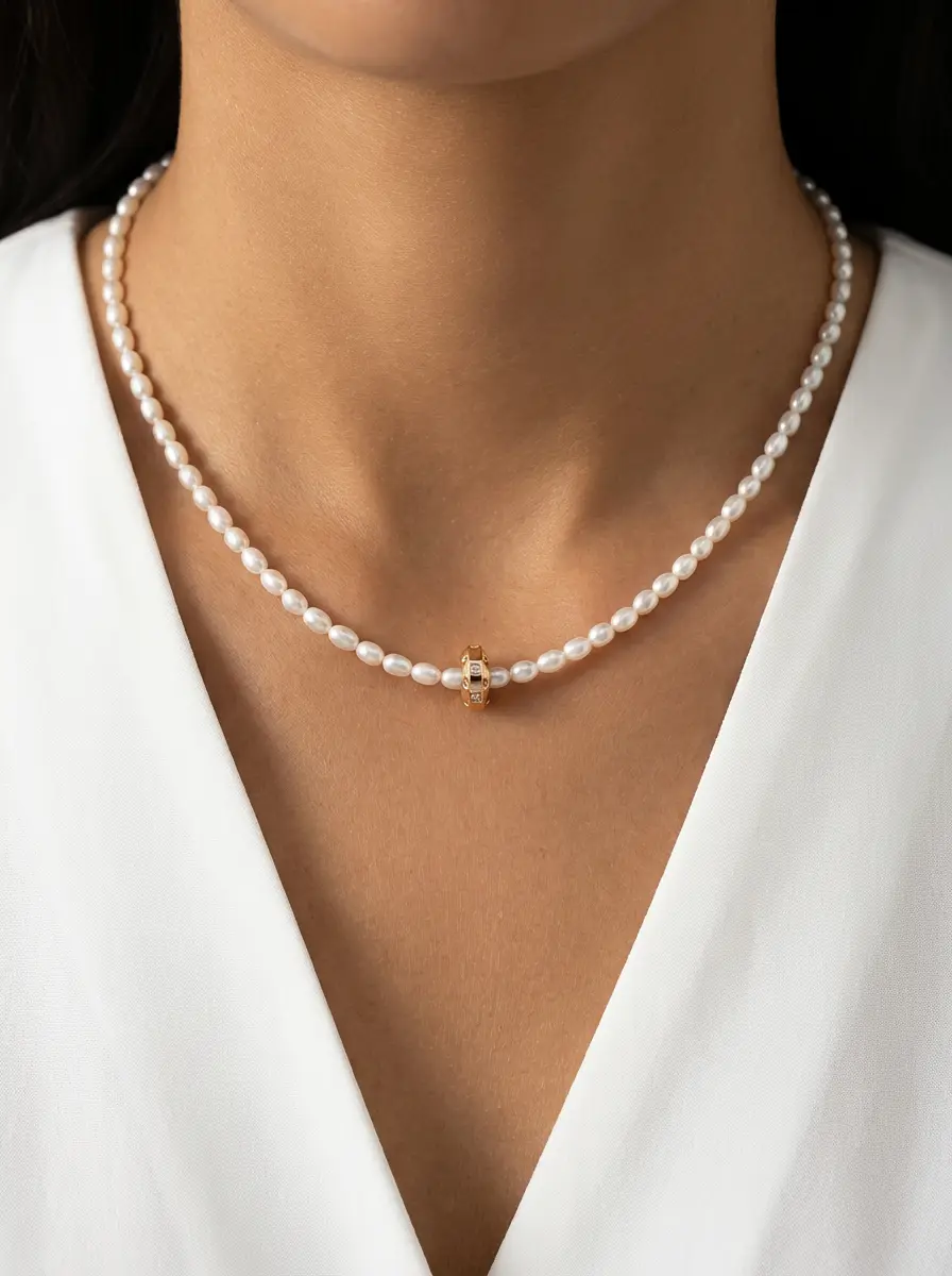 This necklace uses high-quality S925 sterling silver as its foundation. The surface features an 18K gold finish for a warm, luxurious tone. Meanwhile, smooth natural pearls form the chain and introduce a gentle organic texture. In addition, precisely set cubic zirconia stones sit firmly within the pendant. Each element works together to ensure durability, comfort, and lasting brilliance. Therefore, the necklace remains lightweight while still feeling substantial on the neck.