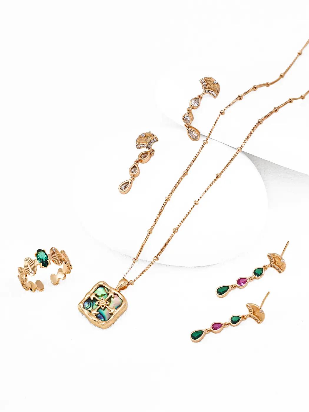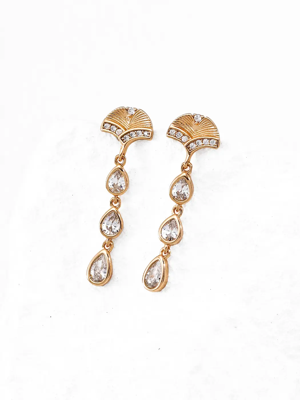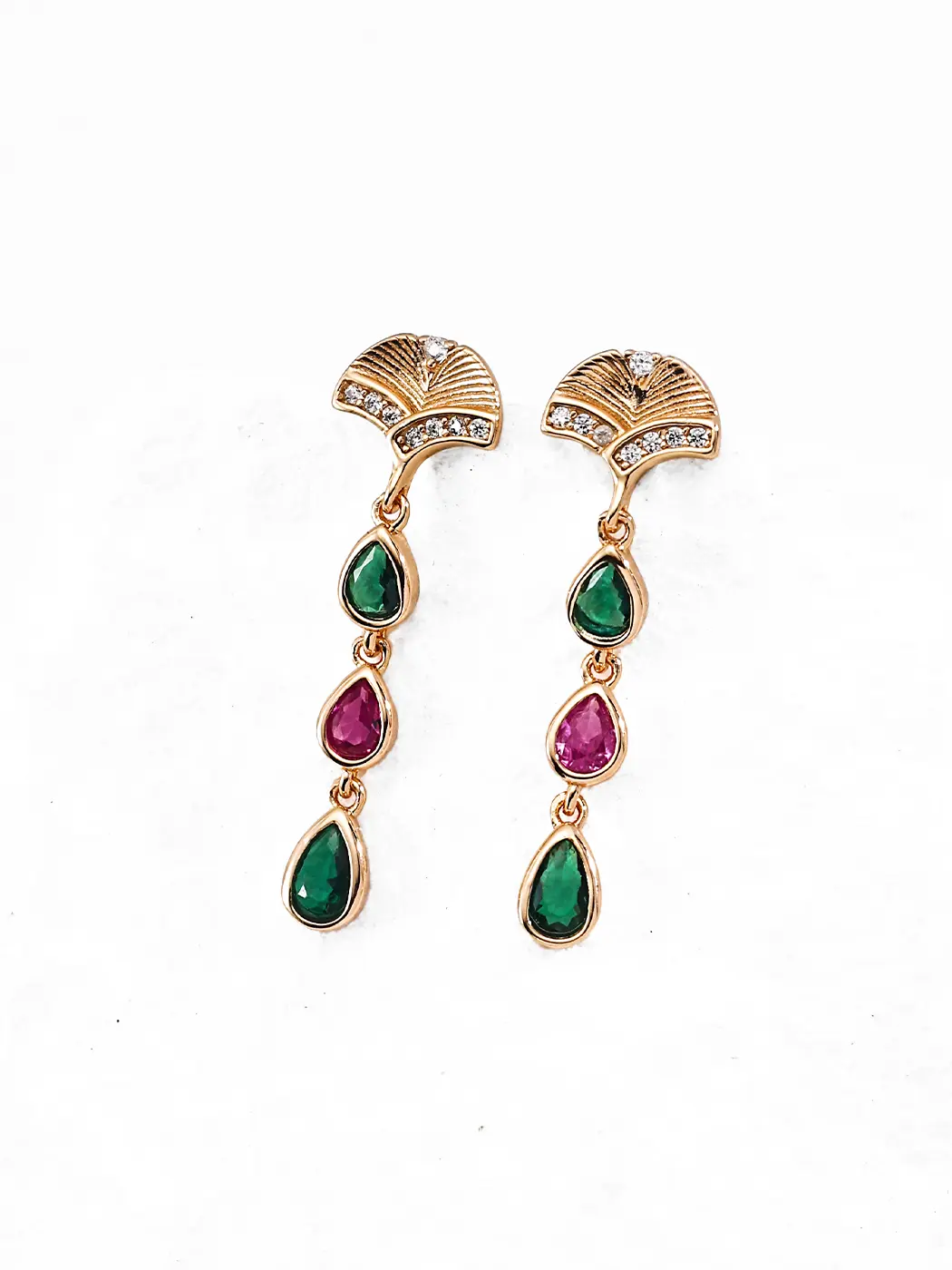These earrings use S925 sterling silver plated with 18K gold, and the finish creates a rich, warm glow. The cubic zirconia stones provide crisp shine, and the clear teardrops elevate the fan motif. In the multicolor version, the emerald-tone and ruby-tone stones add depth and brightness. The metal frame holds each piece with smooth lines, and the lightweight structure ensures comfort throughout the day.