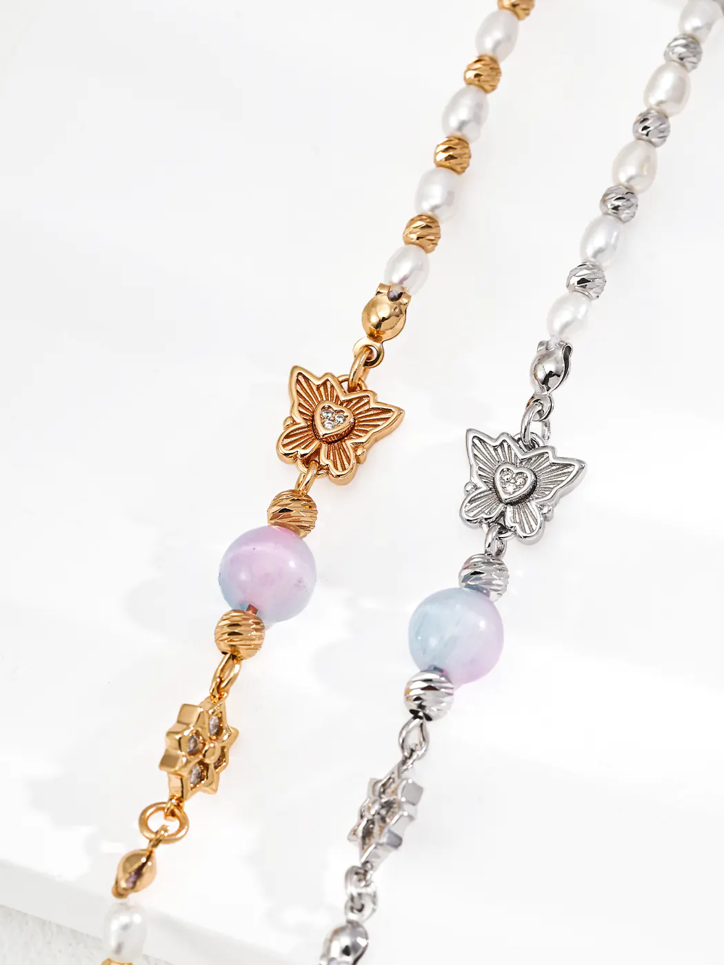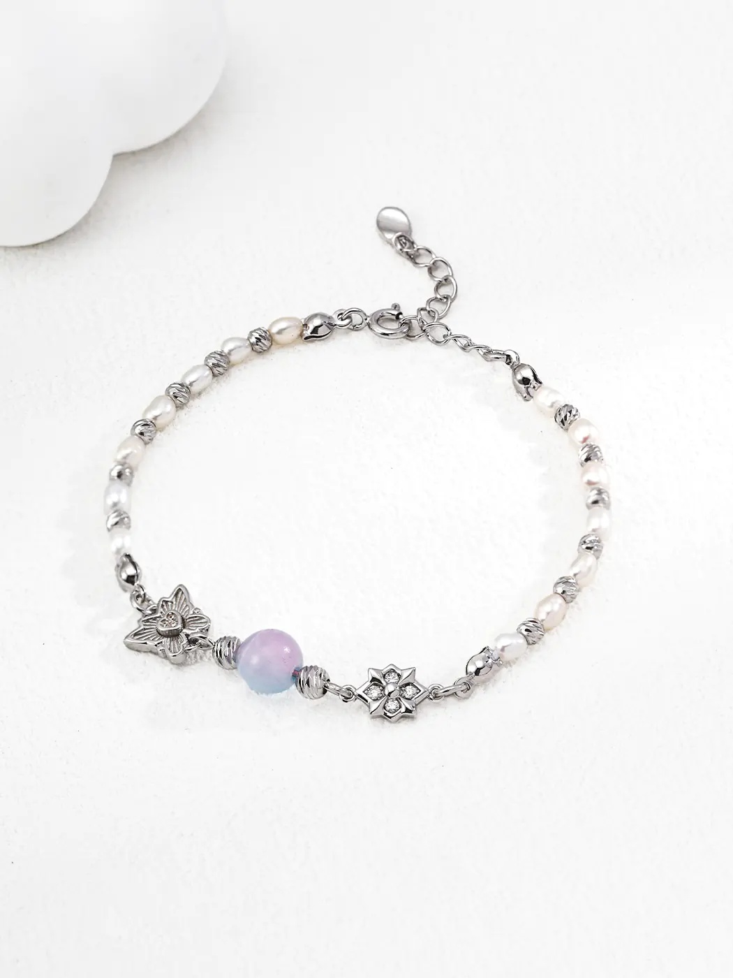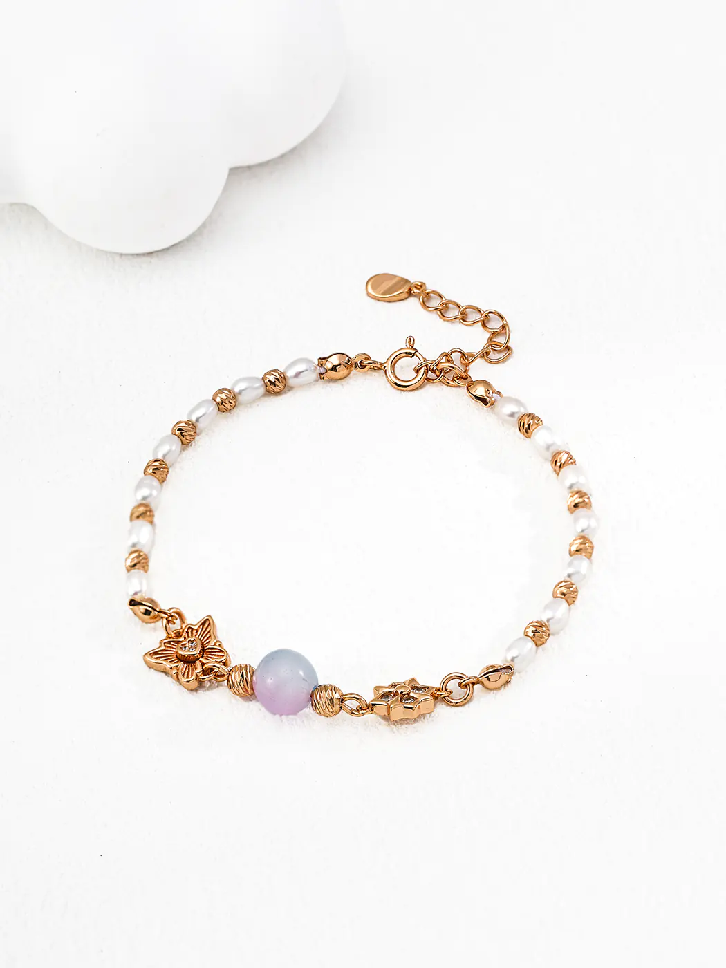 The Forest Sprite Pearl Bracelet captures both playfulness and elegance. Its centerpiece displays a 7 mm gradient cat’s eye glass bead glowing with purple and blue shades. Natural pearls surround the stone, and their luster highlights its dreamy radiance. Moreover, 18K gold-plated accents bring warmth and depth. In addition, zircon details enhance the sparkle, creating a design that feels both lively and refined. Therefore, the bracelet shows a perfect balance of fantasy and elegance.
