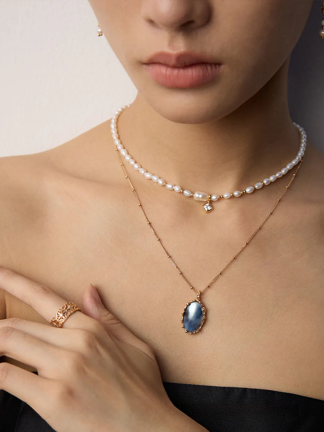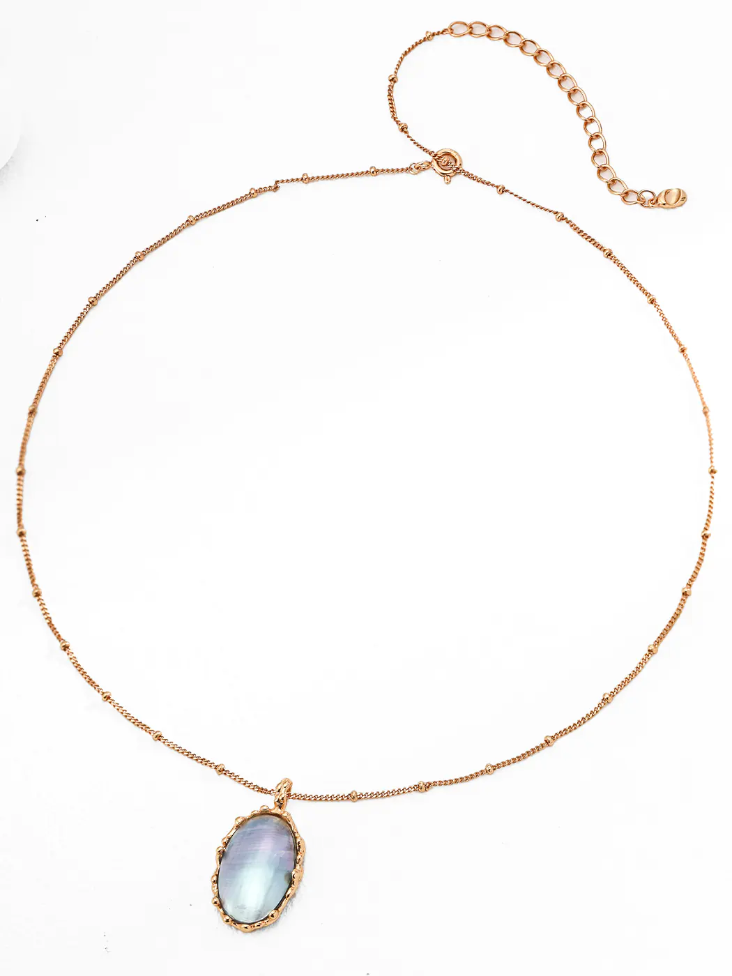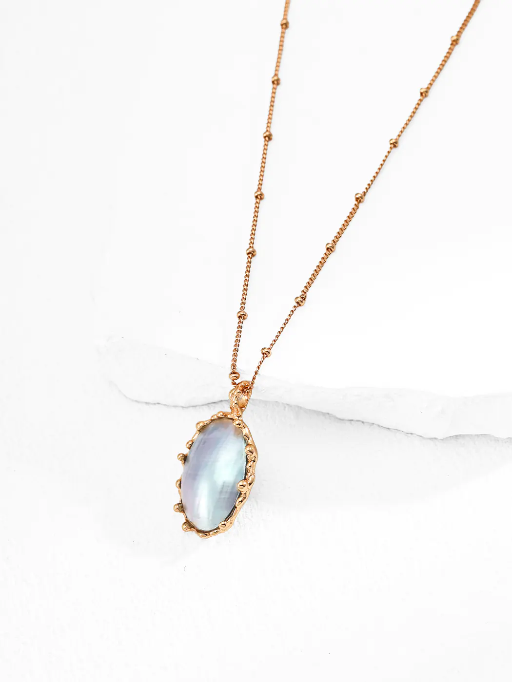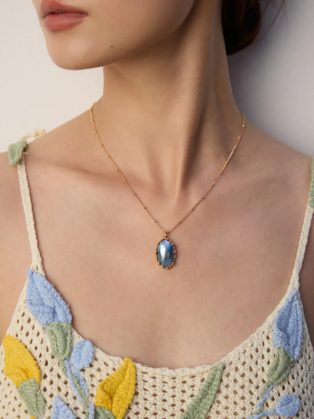 The Gilded Lagoon Mabe Pearl Pendant radiates refined beauty with a luminous centerpiece. The oval-shaped mabe pearl shines with soft rainbow hues, resembling light over tranquil waters. Meanwhile, its surface reflects subtle tones of lavender, green, and blue, creating a dreamy lagoon effect. A sculpted gold frame adds texture and warmth, making the pendant appear both natural and artistic. Moreover, the delicate chain with dotted links provides extra elegance, ensuring a graceful neckline accent.