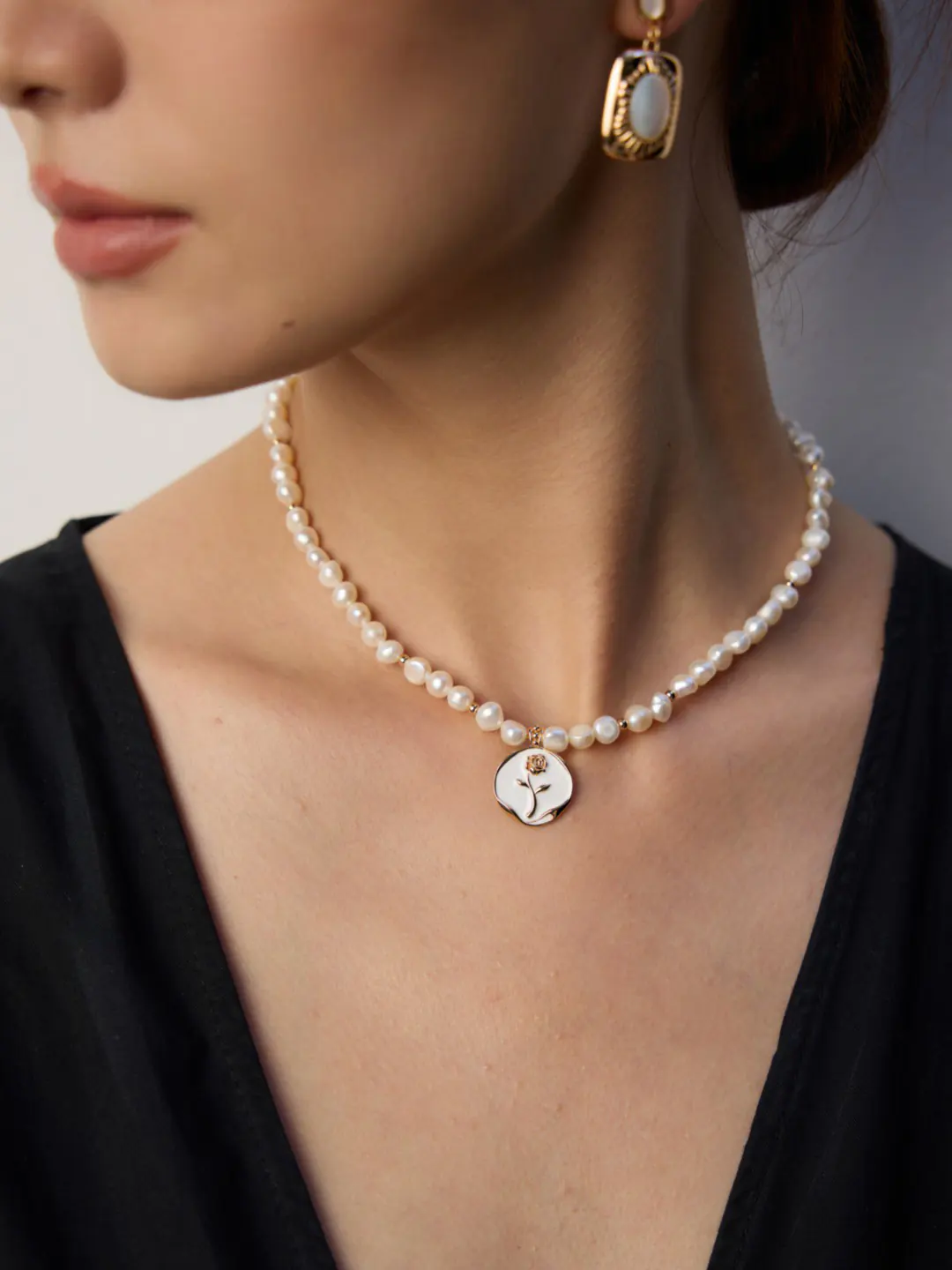 The rose has long symbolized love, devotion, and renewal. Moreover, the combination of natural pearls and enamel emphasizes balance between softness and structure. Consequently, the necklace embodies both delicate femininity and enduring strength.