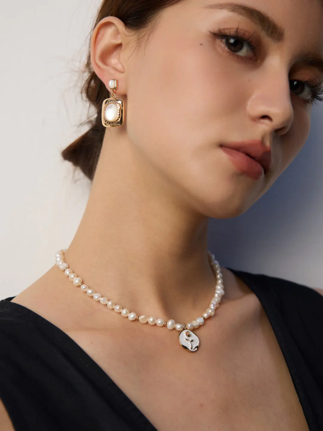 This necklace is crafted from genuine 925 sterling silver with a vintage-gold finish. In addition, it features natural freshwater pearls, carefully selected for their glow and smooth texture. The pendant is finished with enamel detailing that highlights the golden rose motif. Furthermore, the extender chain ensures adaptability, making this necklace suitable for both casual and formal styling. Therefore, this piece merges durability, artistry, and elegance.