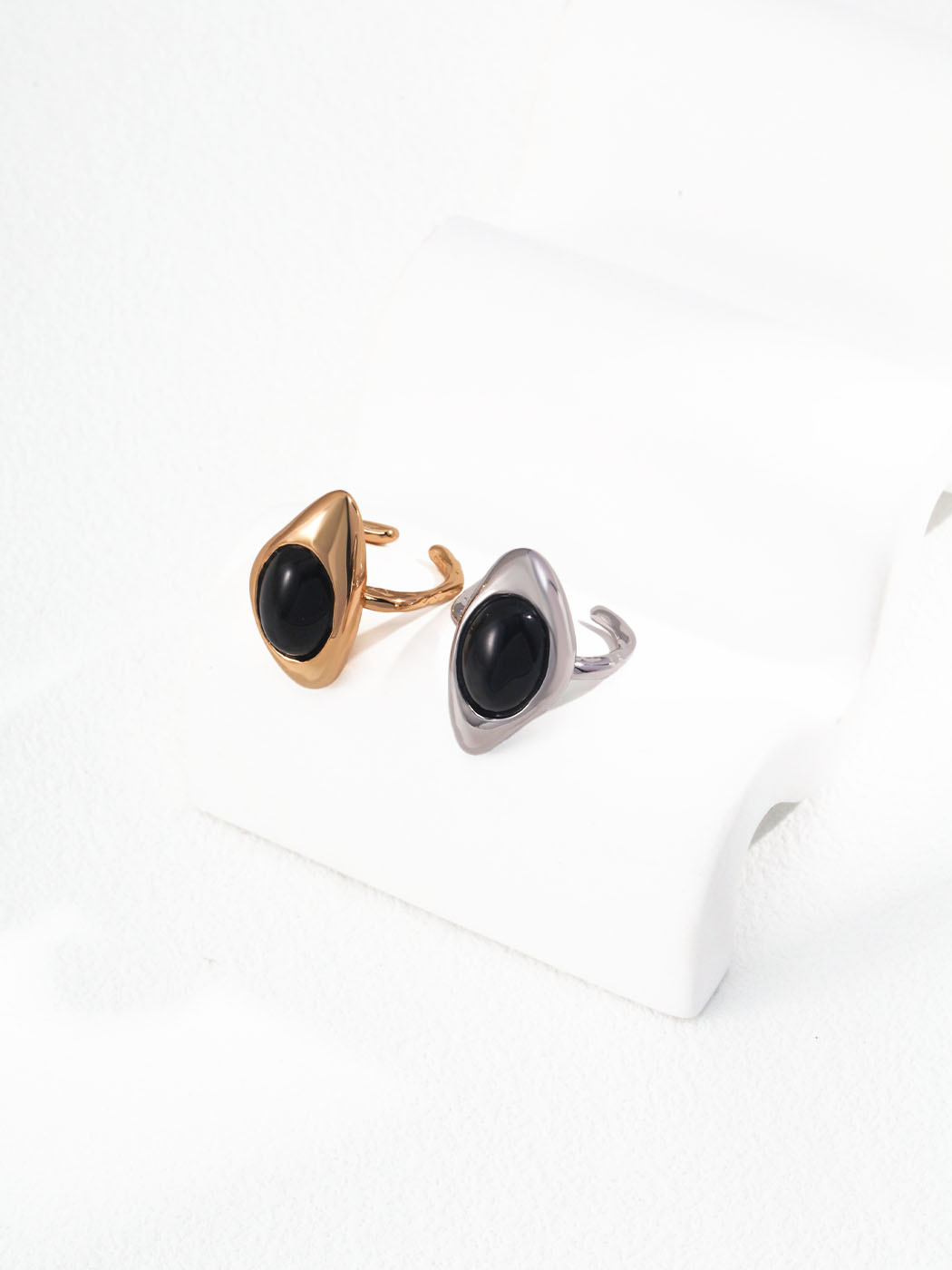 This handcrafted black onyx ring embodies a sculptural aesthetic with bold elegance. The centerpiece features a polished black onyx stone, set within a flowing silver frame that creates organic movement. Its smooth, domed surface reflects light beautifully, while the handcrafted setting highlights artistry and individuality. Offered in both warm gold and cool silver tones, the ring presents a distinctive silhouette that feels timeless yet modern. Because of its sculptural form, the handcrafted black onyx ring stands out as a wearable piece of art.