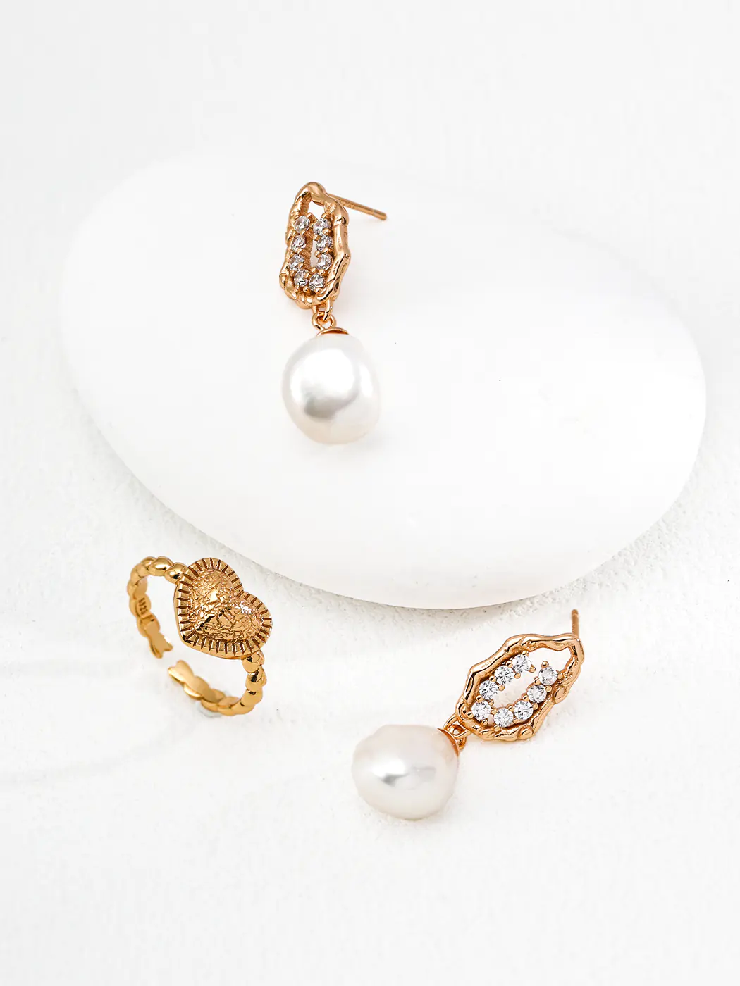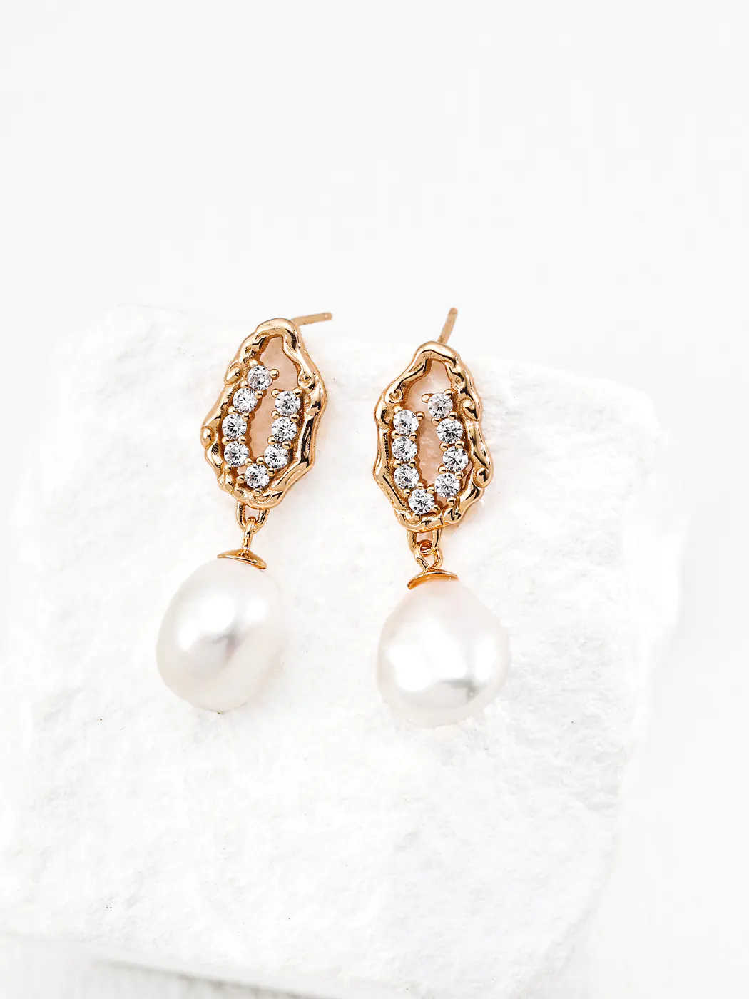These Honey Crystal Natural Pearl Drops earrings capture the beauty of fluid design and organic charm. Inspired by flowing honey, the sculptural gold frame represents liquid movement. Sparkling cubic zirconia stones symbolize crystallized sweetness, while natural baroque pearls, each about 1.2 × 0.8 cm, dangle elegantly below. At 3 cm in height, these earrings balance statement style with refined elegance.