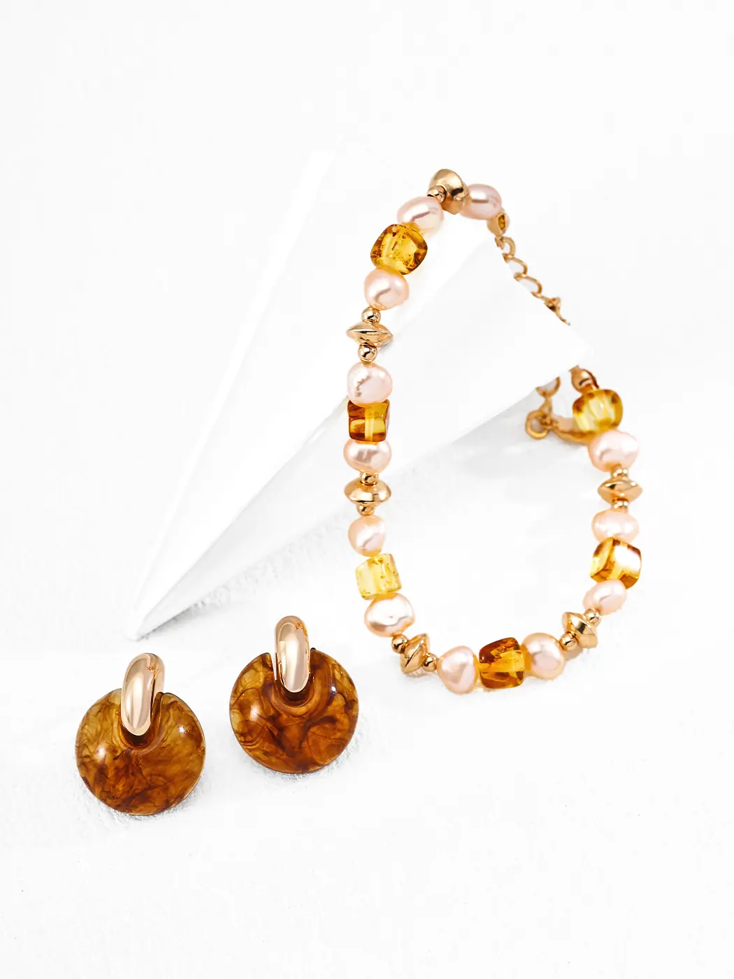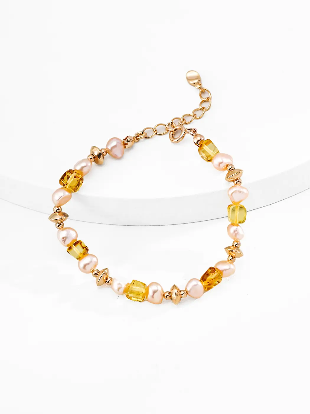 This bracelet pairs beautifully with linen dresses, soft knit tops, and neutral palettes. The warm tones enhance earthy colors, ivory shades, and beige layers. Moreover, the golden glow brings brightness to evening looks, silky blouses, and delicate summer outfits. You can wear the piece alone for a warm, understated statement, or layer it with slim gold bracelets for a richer and more expressive style. The combination of geometric amber and soft pearls creates natural elegance that suits many styles.