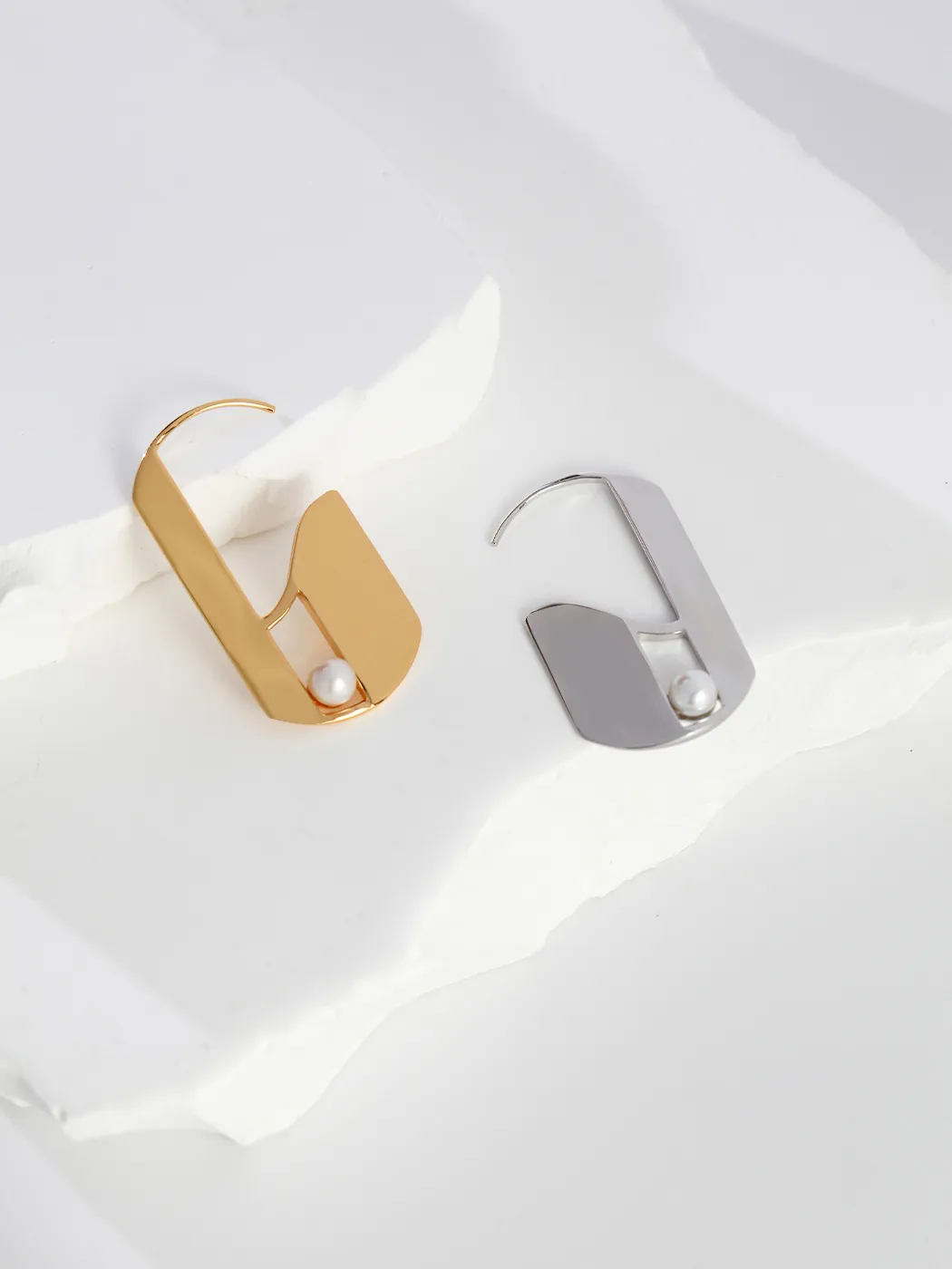 These hook pearl drops redefine elegance with a modern architectural twist. Each earring features a sleek geometric hook shape that flows naturally into a polished silver or gold surface. At the base, a luminous natural pearl rests within the open frame, creating contrast between sharp geometry and soft organic beauty. As a result, the design feels contemporary, artistic, and refined.
