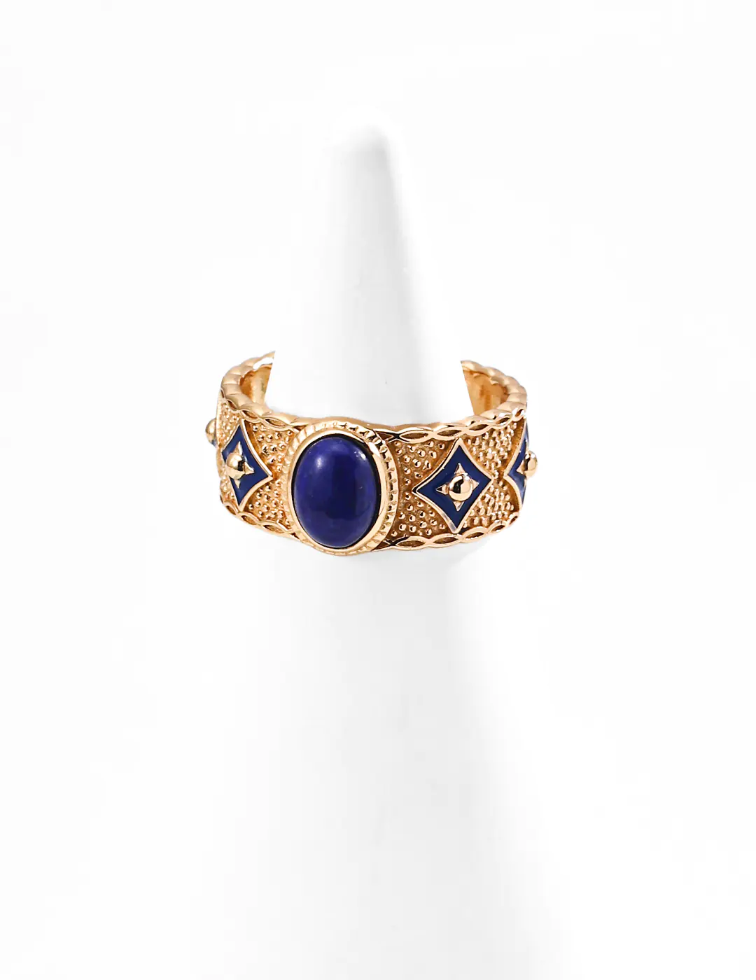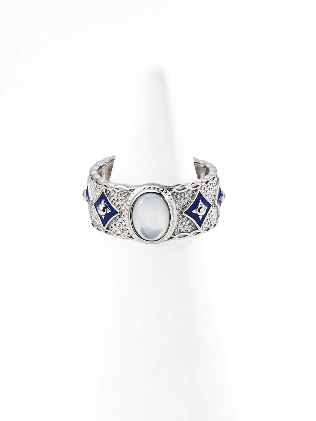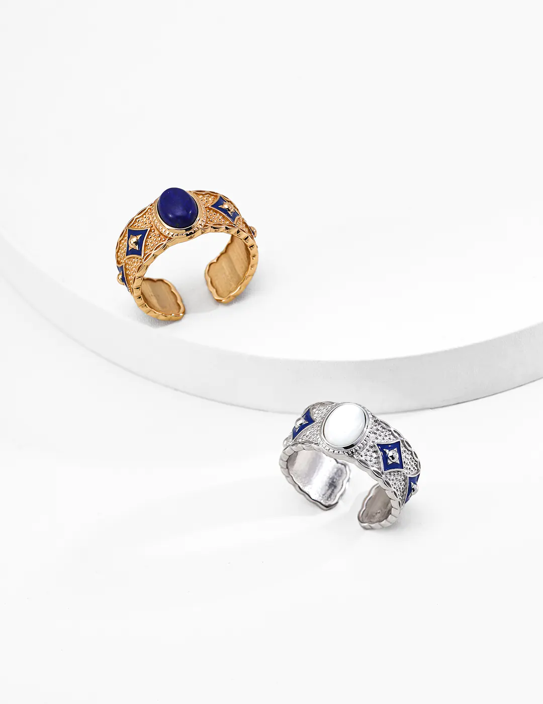 This lapis lazuli jewelry piece reflects timeless artistry and refined charm. The ring features a polished 4 × 8 mm lapis lazuli stone or mother of pearl centerpiece, framed by detailed blue enamel accents. Moreover, the band displays intricate vintage-style patterns that highlight its uniqueness. As a result, the design feels both bold and elegant, offering a perfect mix of color and texture.