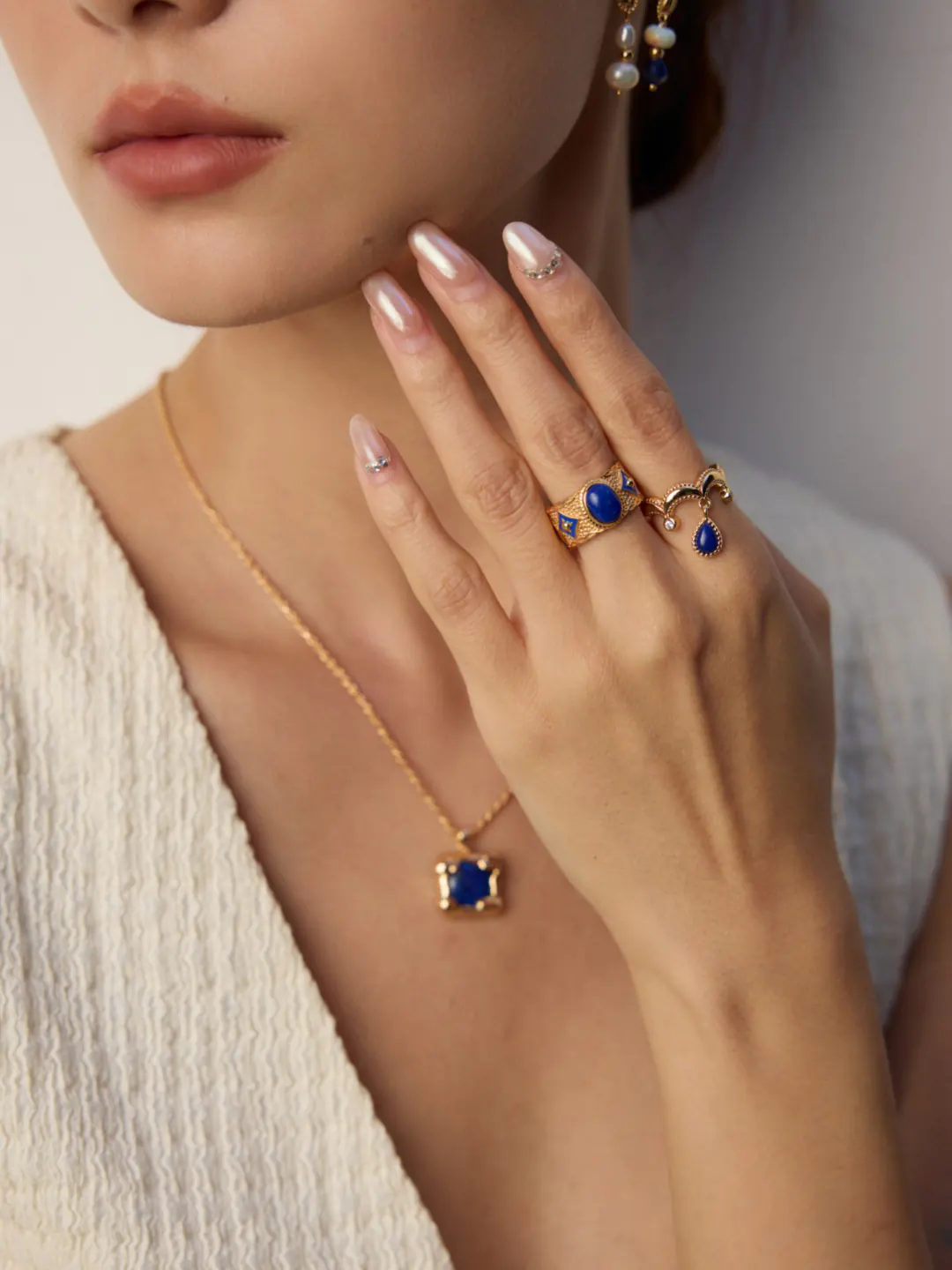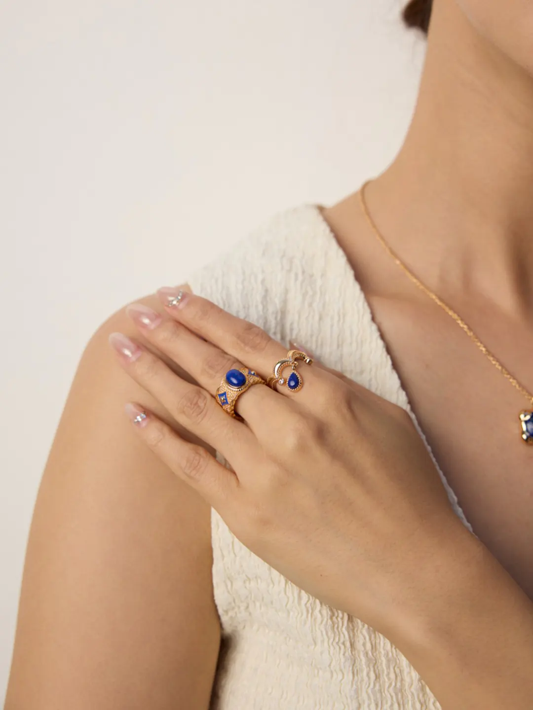 This ring suits many styles and occasions. For example, wear it with bohemian outfits for a chic layered look. Moreover, it adds elegance to office attire with its subtle shine. Finally, the vibrant blue and refined details make it an ideal accessory for evening wear.