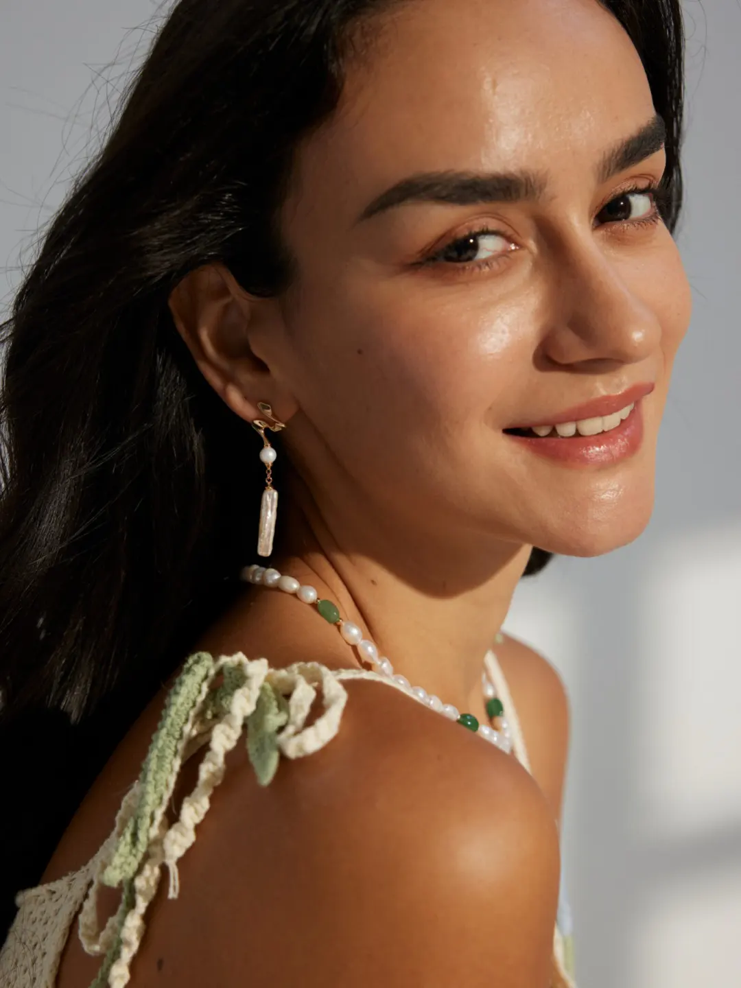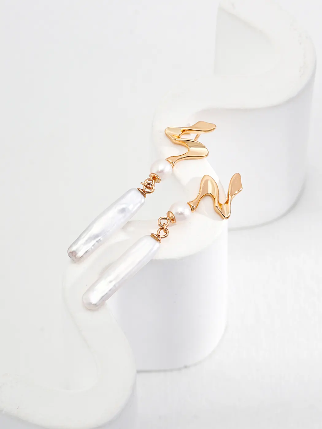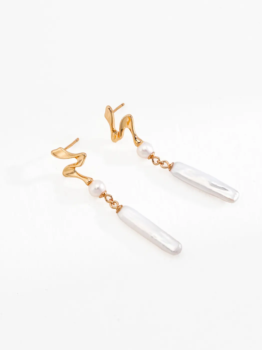 The Liquid Curve Baroque Pearl Drops frame the ear with a fluid, sculptural line. A wavy stud flows into a petite round pearl. Then a slim baroque stick pearl swings lightly below. The drop length measures 5 cm for graceful movement. Meanwhile, the warm vintage gold tone enriches the white luster. Each surface catches light and adds shimmer. As a result, the profile looks elongated and elegant. The look feels modern, yet it nods to classic romance.