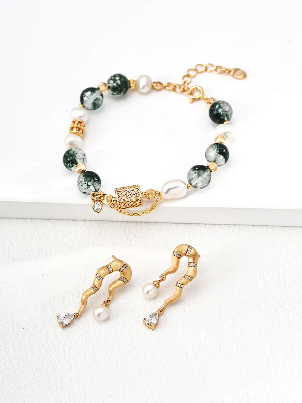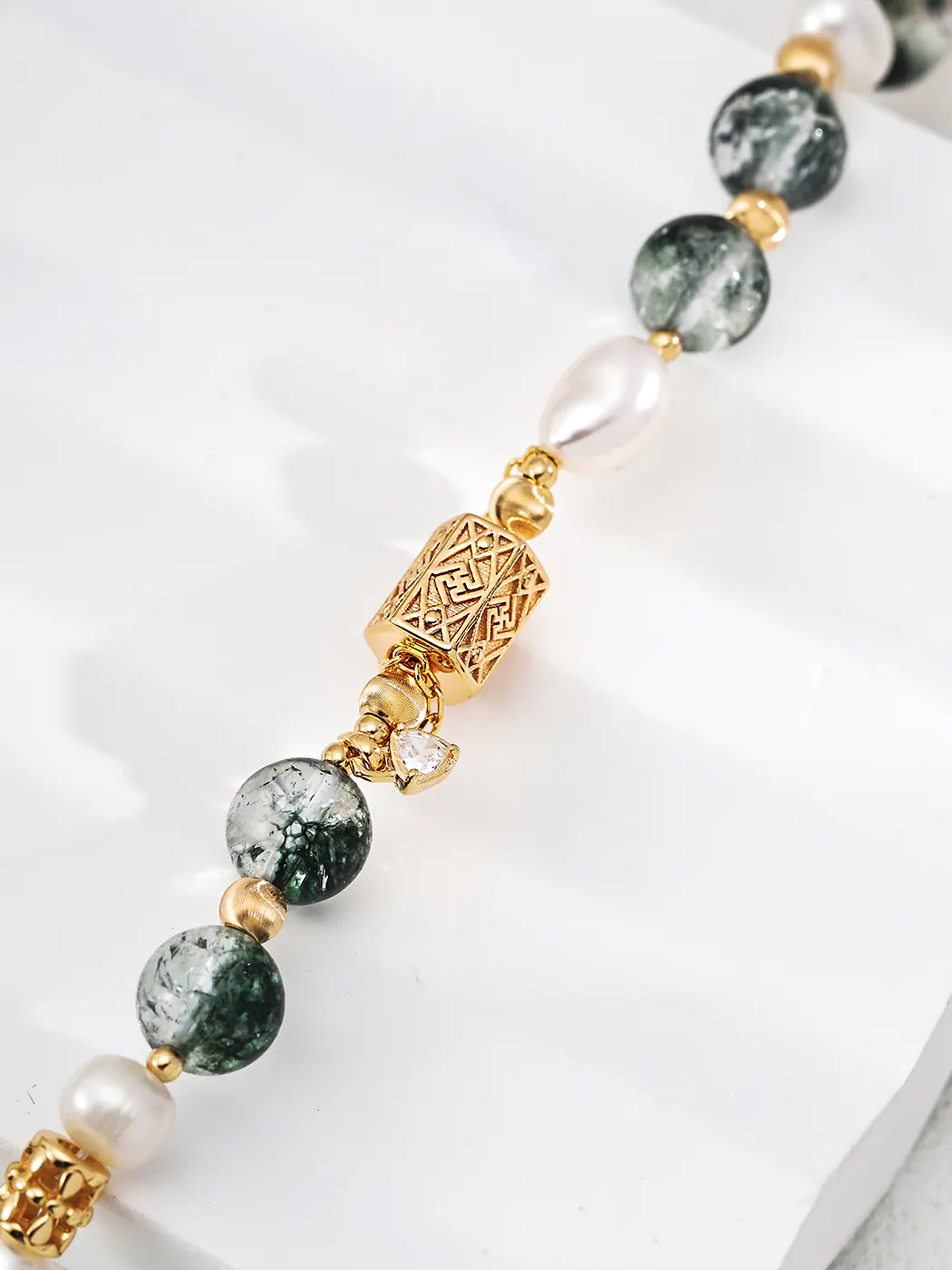 This Lotus Lake Natural Pearl Bracelet evokes the calm elegance of a summer lakeside. The design combines luminous 6 mm natural pearls with 8 mm ghost crystal beads, creating a refreshing contrast of white and deep green tones. The centerpiece features an intricately engraved gold-plated silver charm with a delicate dangling zircon, adding sophistication and subtle sparkle. Measuring 16 cm with a 3 cm extender, this bracelet offers both comfort and adjustability.