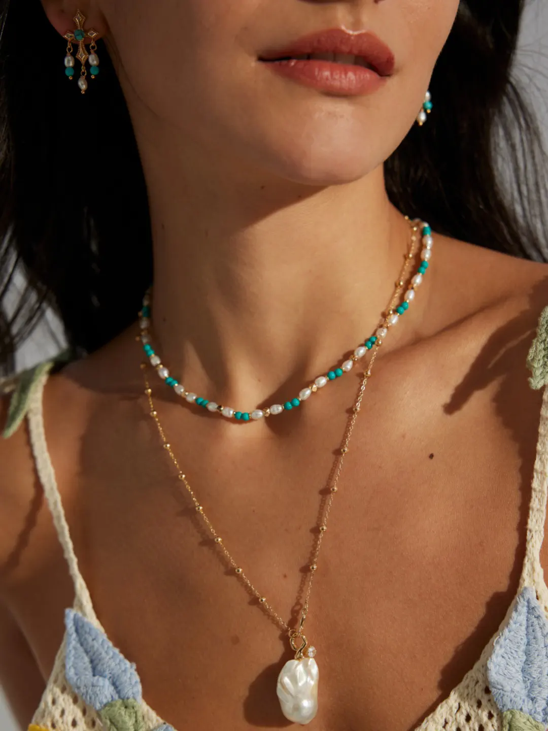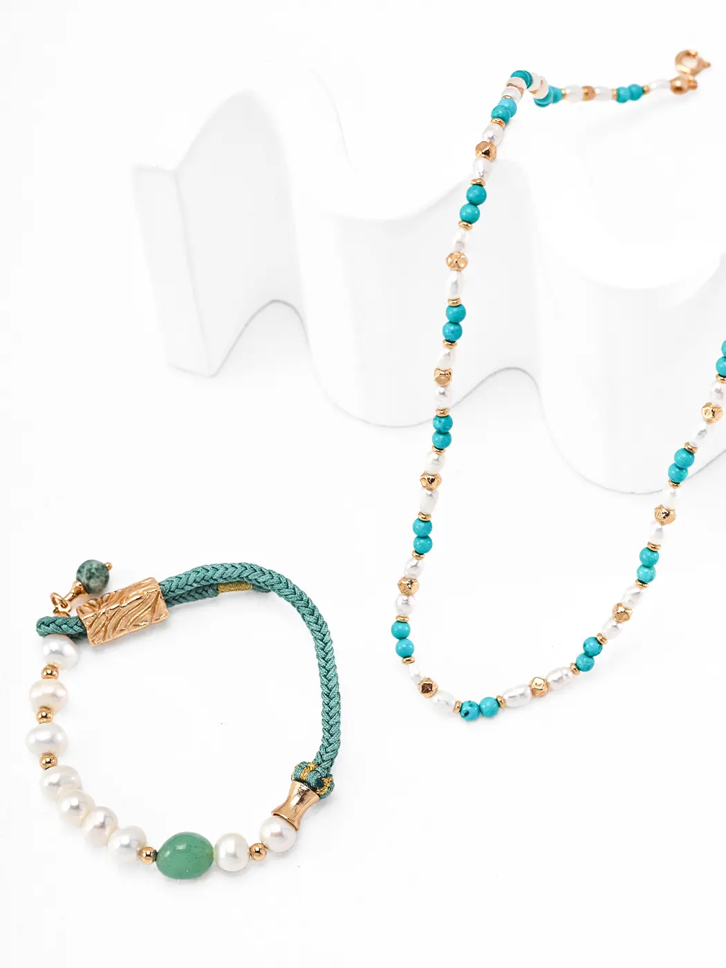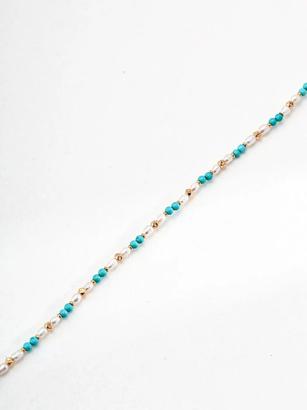 This necklace uses S925 sterling silver for lasting comfort and shine. The gold-plated finish brings warm contrast and highlights each bead with subtle brightness. The natural pearls measure around 3–4 mm, offering soft glow without heaviness. Turquoise beads measure about 3 mm, and their blue-green shade adds energetic freshness. The chain includes a 38 cm length with a 6 cm extender for easy adjustment and relaxed wear. Every bead feels smooth, and the entire structure stays lightweight.