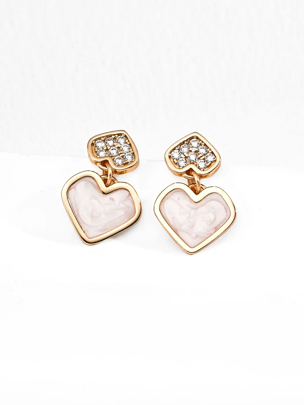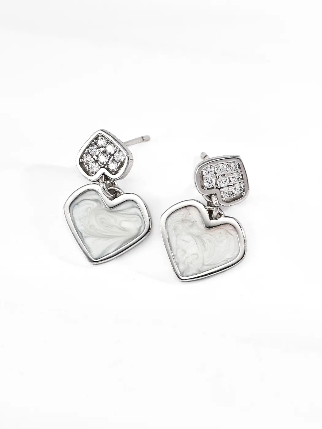 These earrings use S925 sterling silver as the foundation. The milky enamel surface adds texture and fluid visual movement. The zircon stones provide crisp brilliance and highlight the upper part of the earrings. Additionally, the warm or cool metal plating enhances the color story and keeps the heart shape refined. The structure stays comfortable for daily wear while maintaining a strong decorative presence.