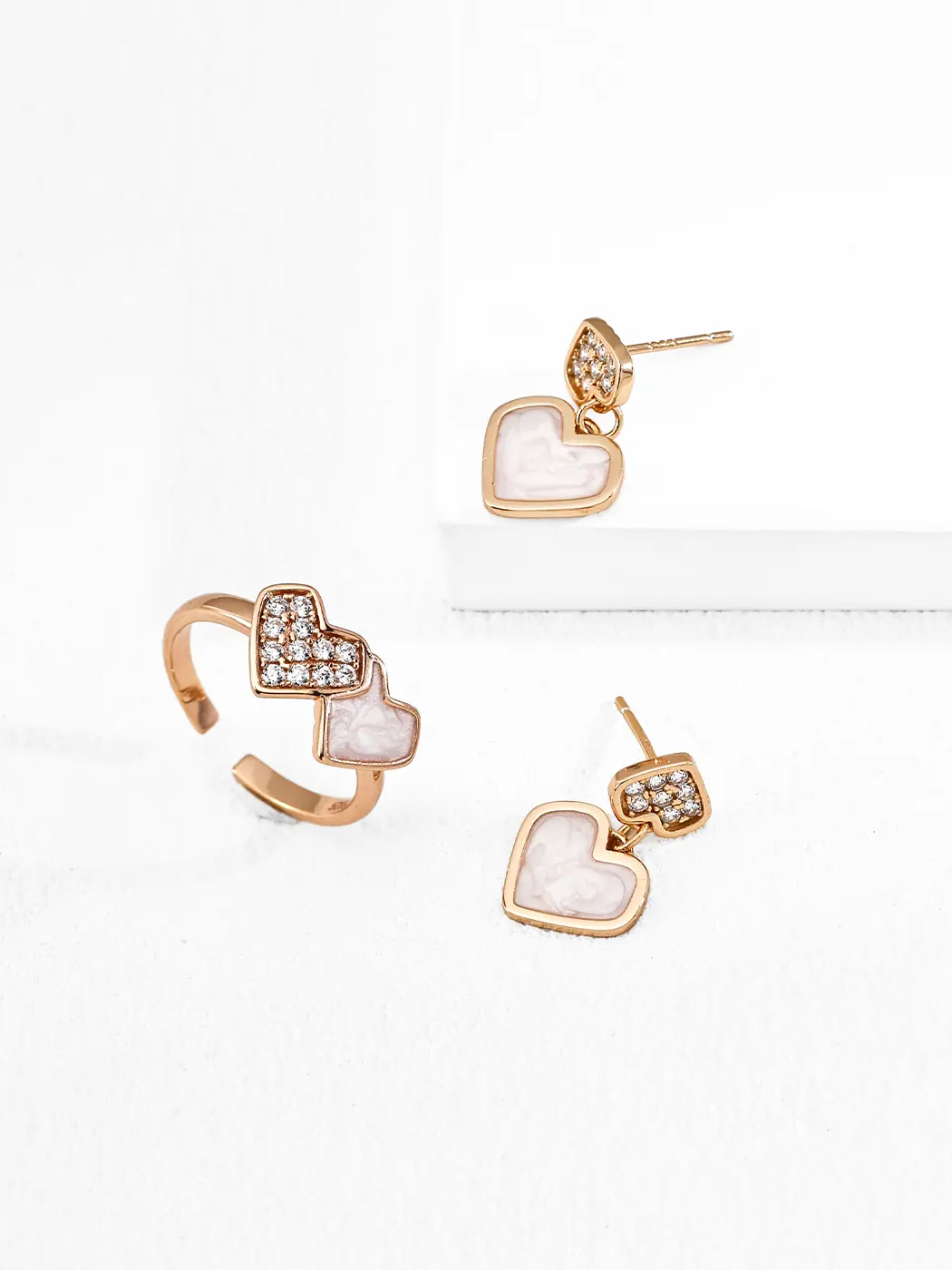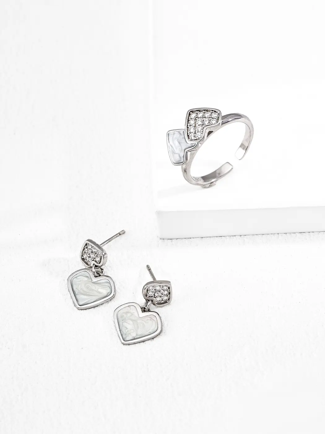The swirling milky pattern symbolizes softness and emotional calm. It brings a peaceful tone that pairs well with subtle sparkle. The zircon cluster expresses brightness and youthful charm. Together, the elements shape a romantic style that still feels modern. The heart motif remains classic, yet the enamel pattern adds depth.