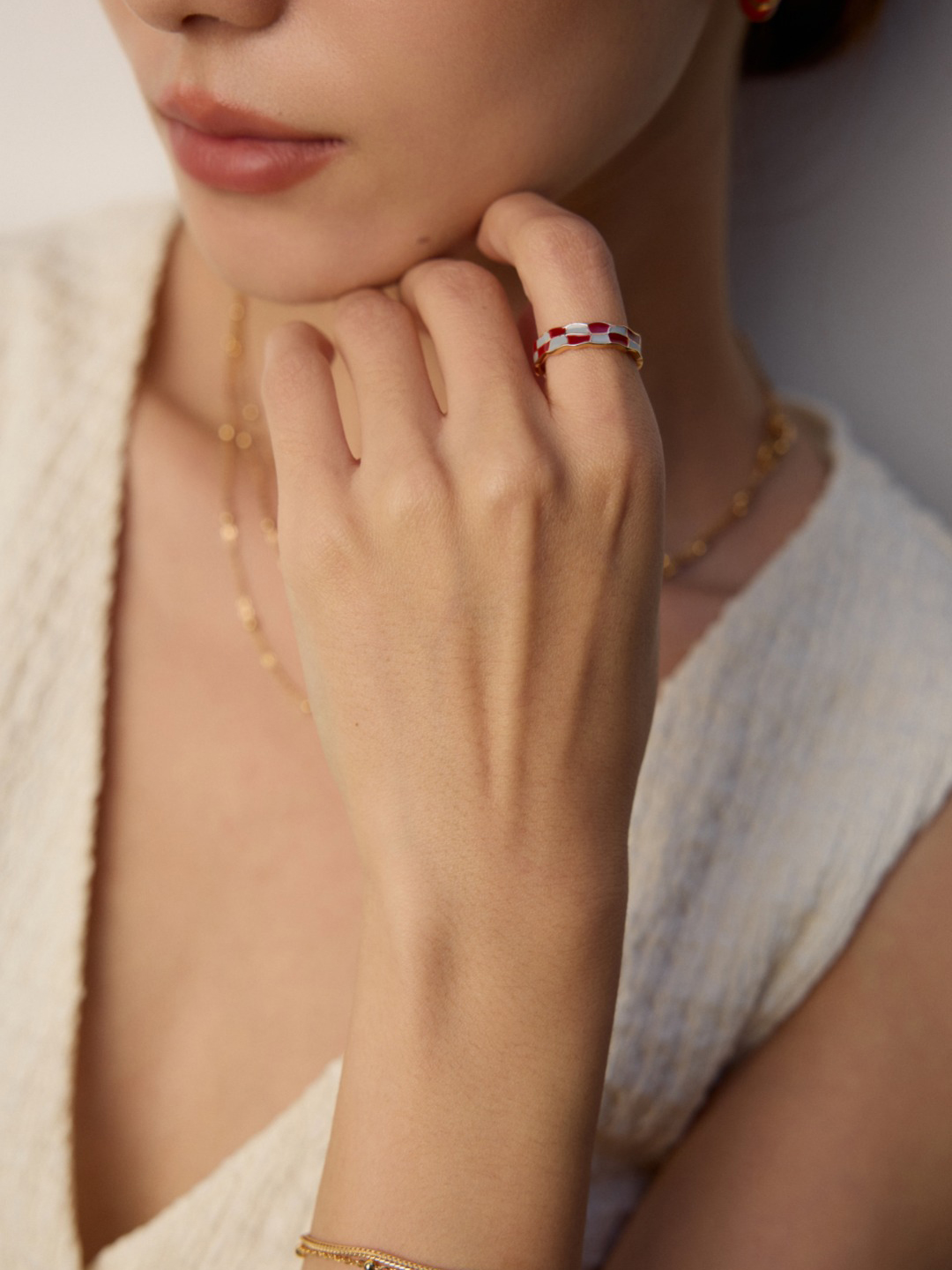 The ring is crafted from premium 925 sterling silver, ensuring both strength and lasting shine. In addition, the surface is finished with a vintage gold tone that enhances the warm glow of the metal. Skilled artisans apply enamel by hand, combining deep red and cool blue shades for a striking contrast. Because of its adjustable structure, the ring can comfortably fit different finger sizes. Furthermore, the enamel’s smooth texture adds refinement, while the golden edges highlight the retro mosaic style.