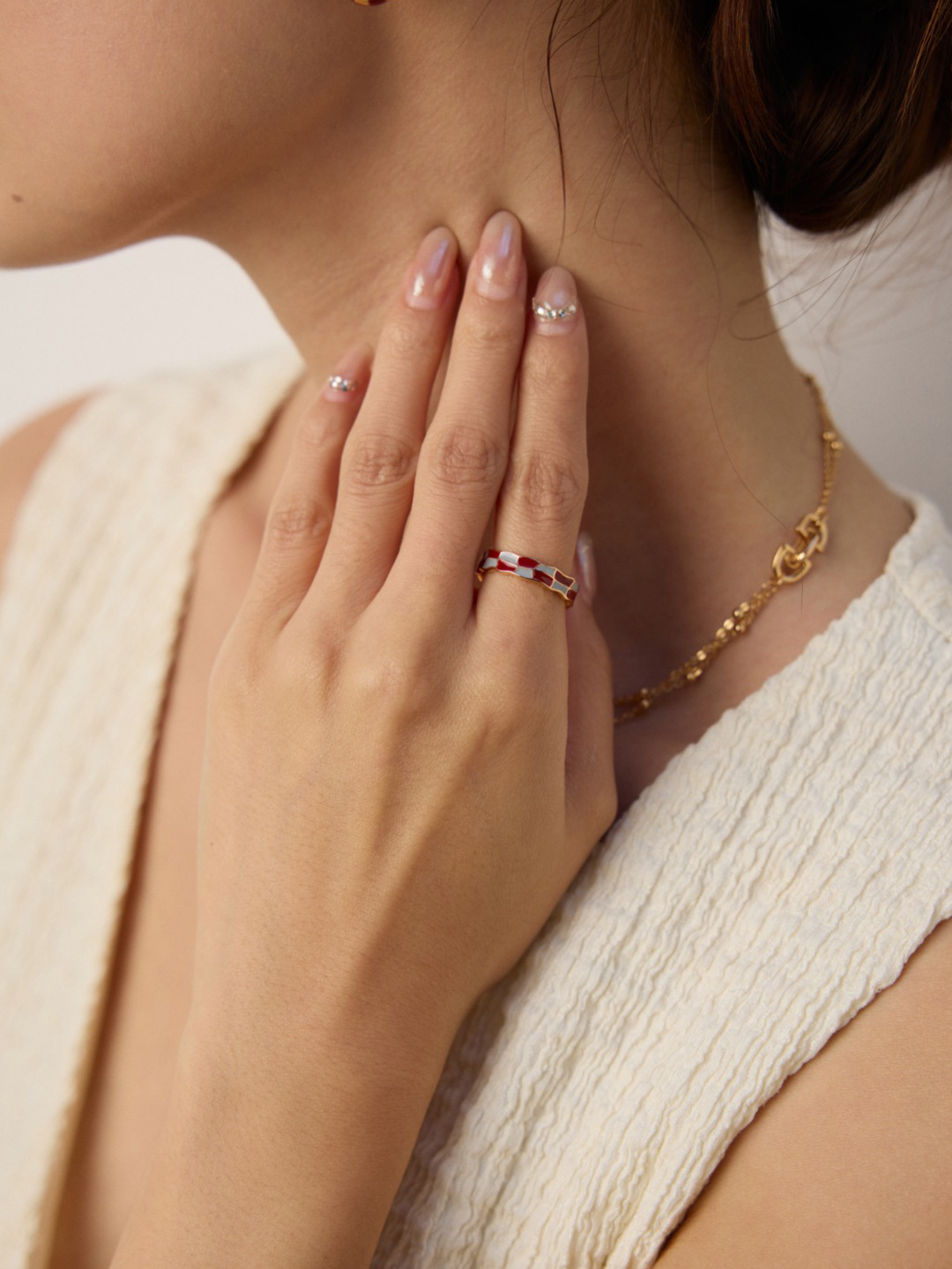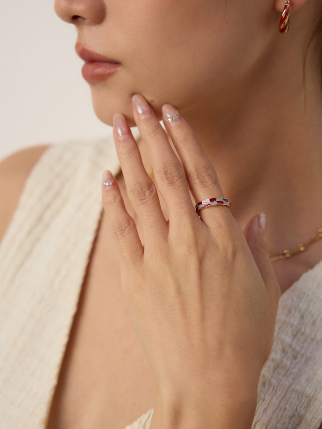 This mosaic enamel silver ring showcases a unique artistic pattern inspired by retro design. The band is decorated with alternating red and blue enamel blocks, outlined by subtle golden lines that highlight the mosaic effect. Its open design allows easy adjustment, making it both stylish and practical. Moreover, the smooth enamel finish reflects light beautifully, creating a vibrant yet elegant look. As a result, the mosaic enamel silver ring becomes a versatile accessory that can be worn daily or on special occasions.