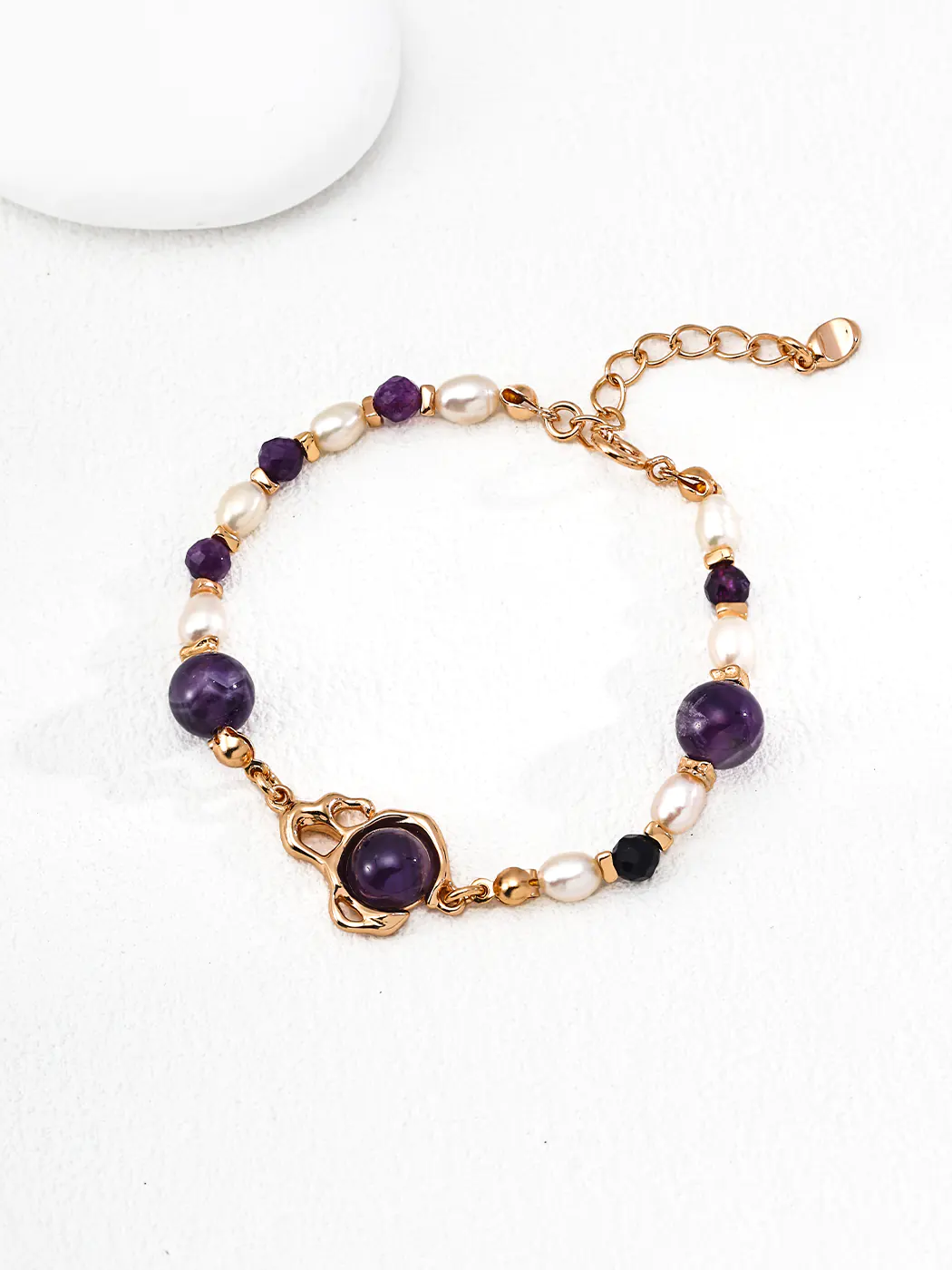 This Mystic Liquid Amethyst Bracelet embodies fluid artistry and gemstone elegance. Its centerpiece features a liquid metal-inspired design that cradles an 8 mm amethyst stone, radiating a deep, captivating purple glow. Smaller 4 mm amethyst beads and 4 × 6 mm natural pearls alternate along the bracelet, creating a luxurious mix of texture and luster. The 18K gold-plated finish enhances the organic form, offering a modern yet regal aesthetic. At 16 cm plus a 3 cm extender, the bracelet ensures both comfort and adjustability.
