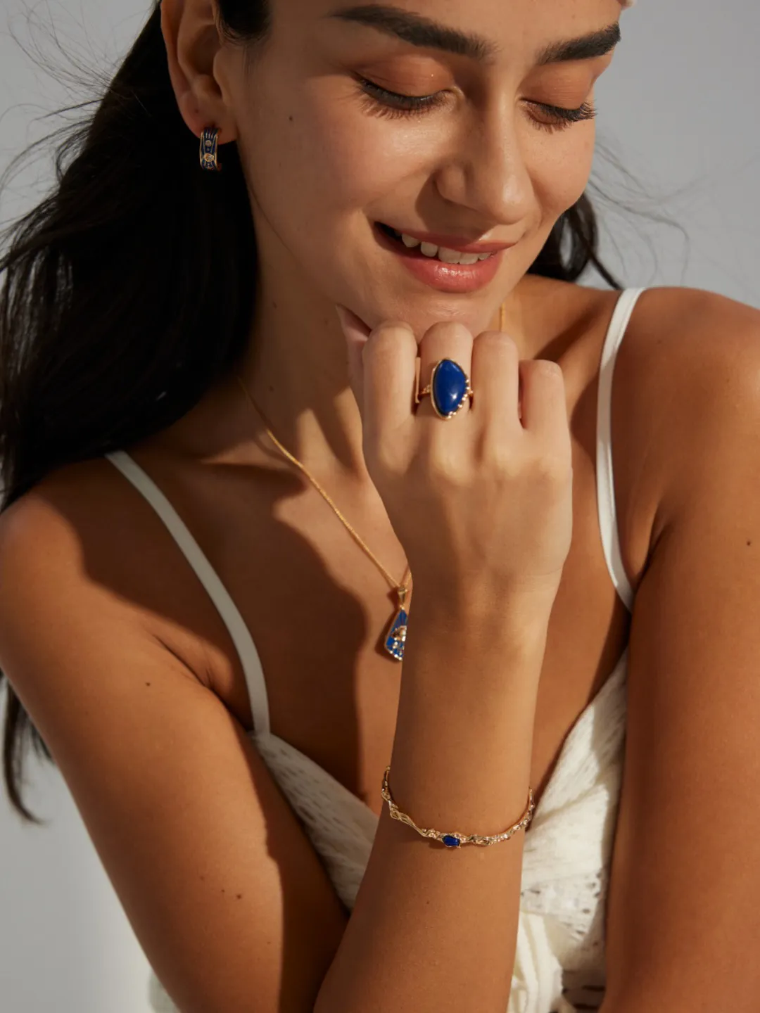 This natural lapis lazuli ring makes a striking impression with its deep celestial hue. The bold gemstone reveals golden flecks across its surface, creating a starry-night effect. Moreover, the asymmetric oval cut adds individuality, while the vintage gold-plated silver band frames the stone with warmth. As a result, this ring feels both artistic and timeless, making it a standout accessory.