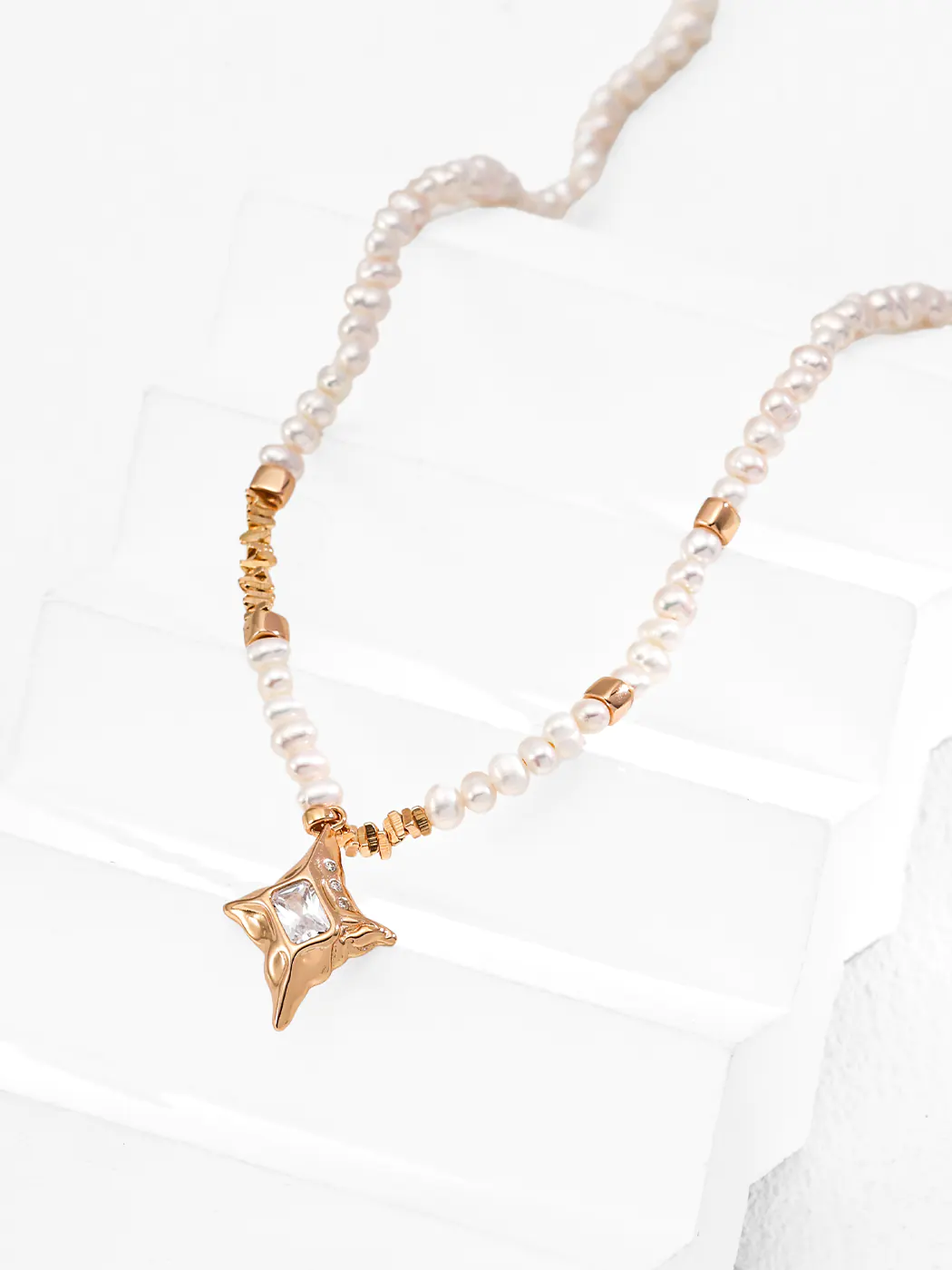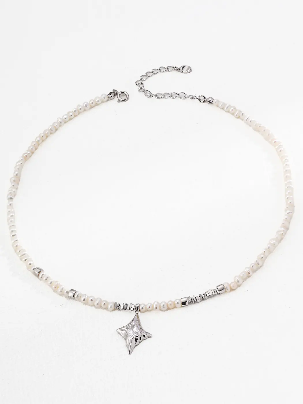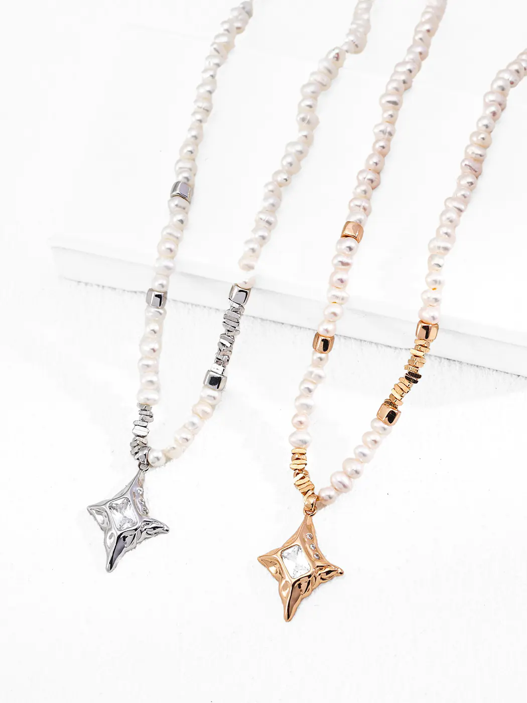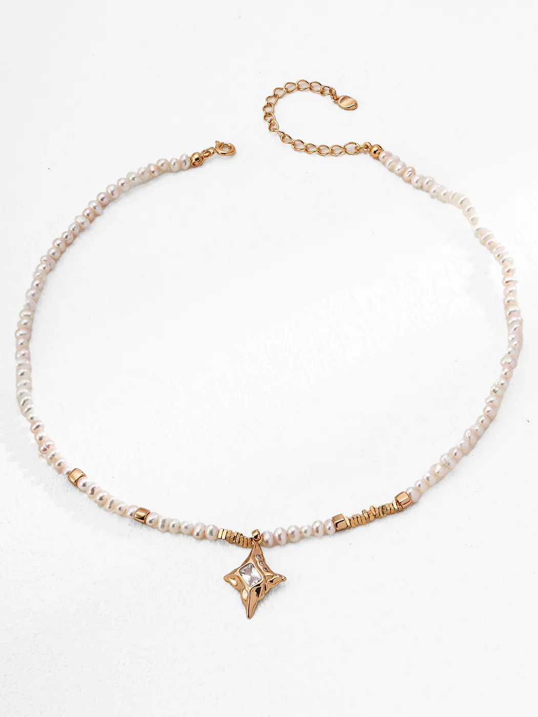 The Noble Star Pearl Pendant necklace captures refined elegance through its star-shaped pendant. The 2 cm pendant, crafted with graceful lines and sparkling zircon, shines as the focal point of the design. Moreover, natural freshwater pearls of about 4 mm are arranged along the 38 cm chain, with an additional 6 cm extender for flexibility. As a result, this necklace balances celestial inspiration with classic sophistication, making it a versatile accessory for modern women.