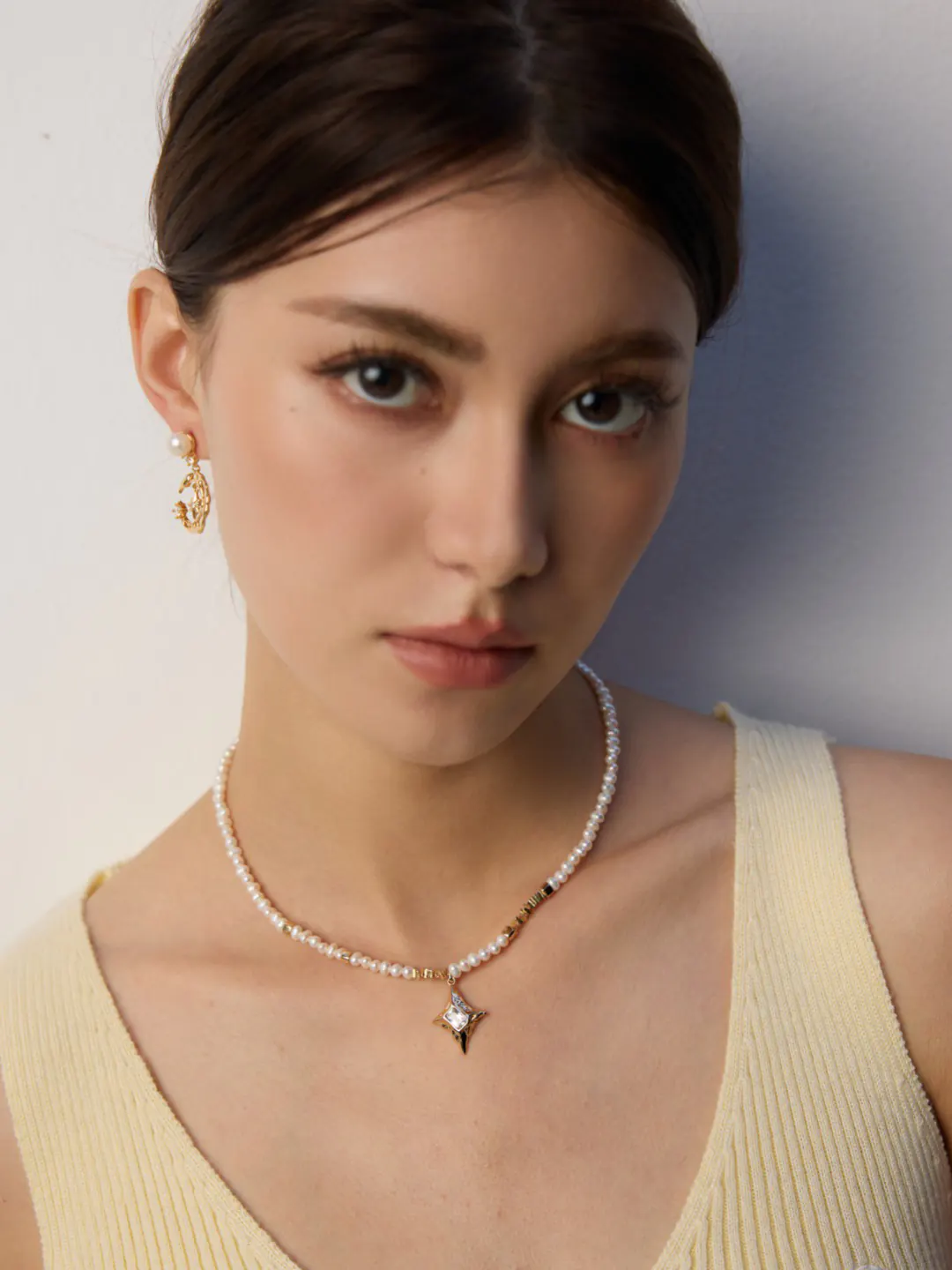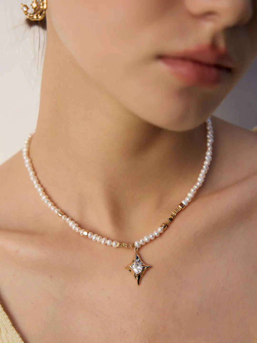 This necklace pairs beautifully with many outfits. For casual styling, combine it with soft knitwear or linen blouses to highlight the gentle glow of pearls. Moreover, it enhances professional attire when layered with structured blazers or minimalist dresses. In the evening, the shimmering zircon and warm gold tones complement satin or velvet fabrics. Furthermore, the celestial star design makes it perfect for layering with slim gold chains, creating a chic, curated look.