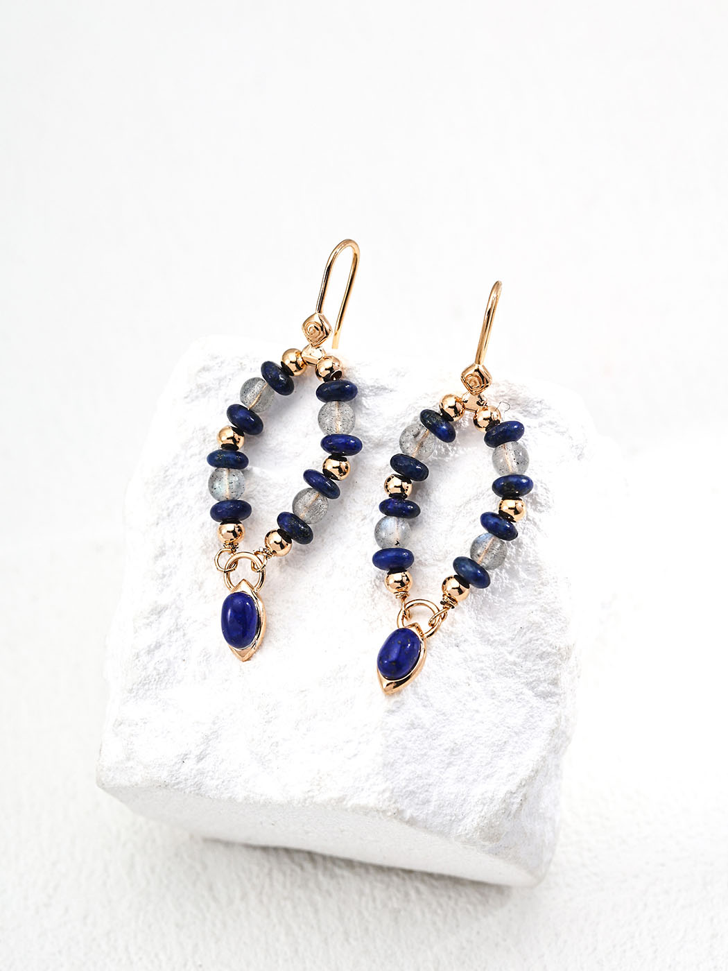 These earrings are crafted from S925 sterling silver with a vintage gold finish. In addition, shimmering 4 mm moonstones add soft translucence, while lapis lazuli beads introduce deep blue contrast. Golden accents enhance warmth and texture, creating balance within the design. Therefore, the combination of moonstone, lapis, and silver delivers harmony, durability, and elegance. Furthermore, the secure dangle structure ensures comfortable wear throughout the day.