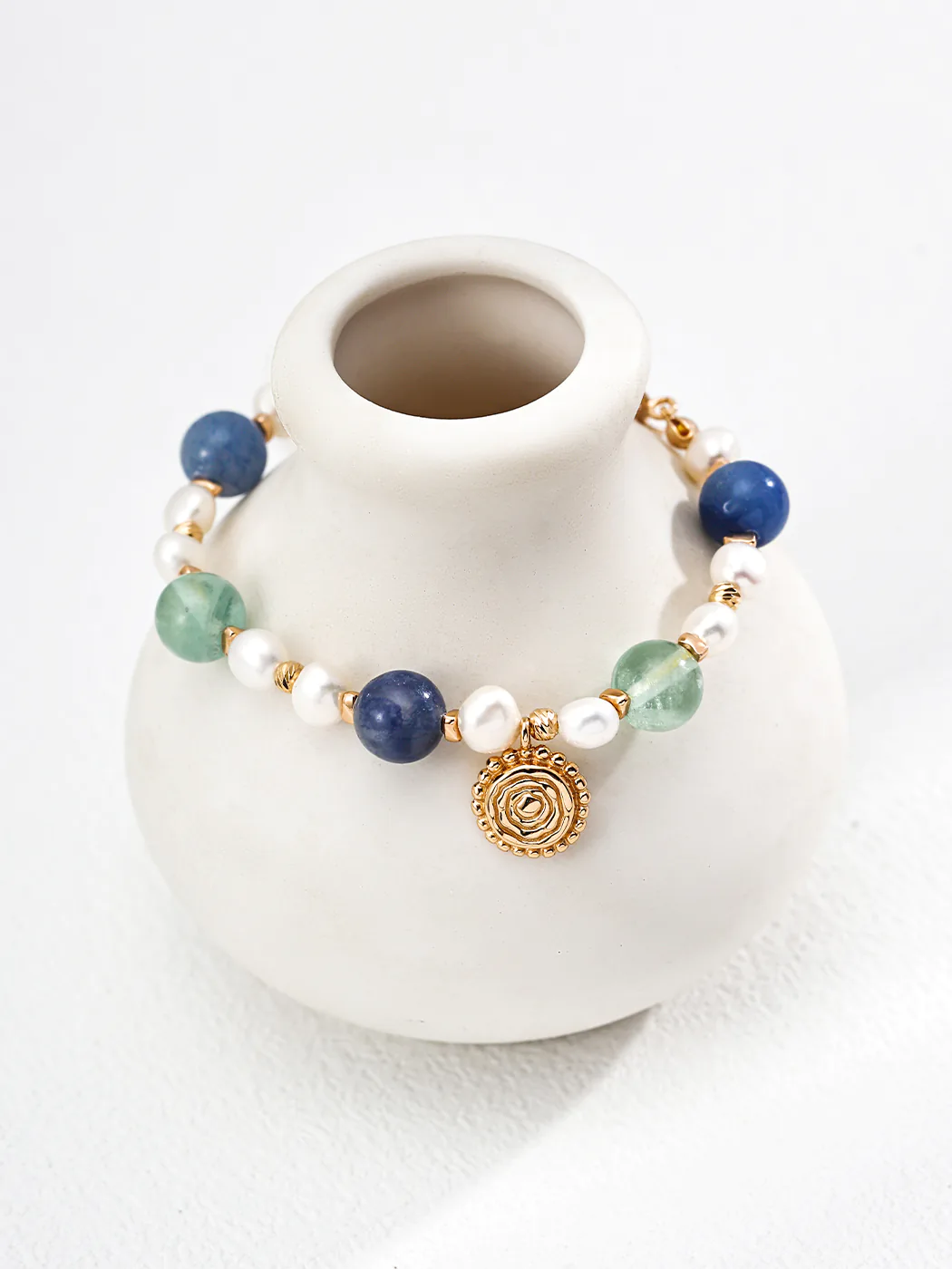 - Features natural pearl, fluorite, and blue aventurine beads