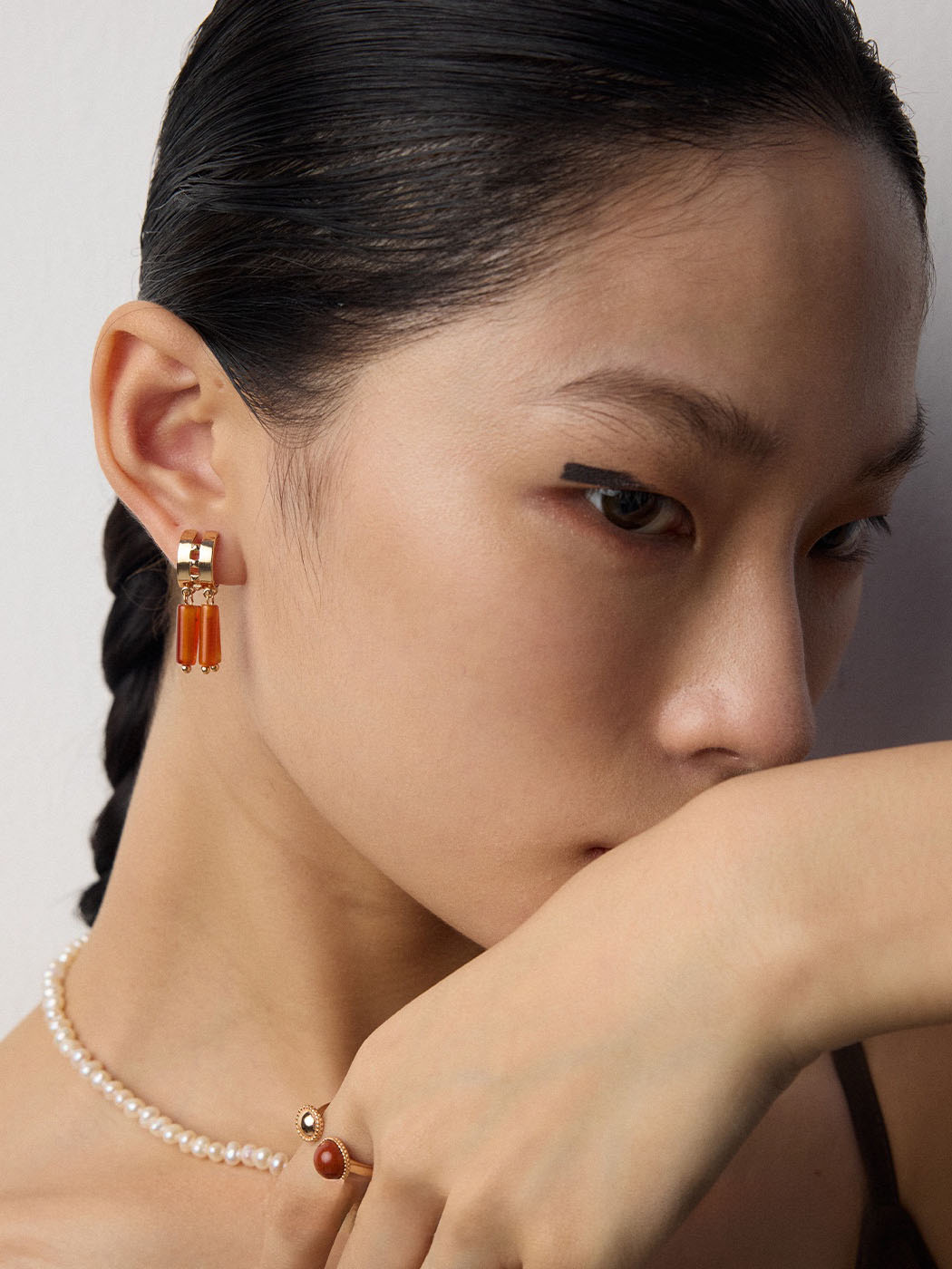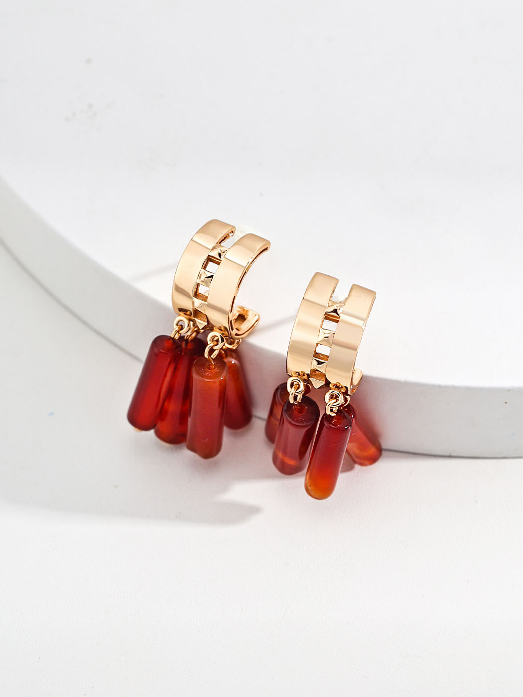 Crafted from 925 sterling silver, the earrings are finished with a vintage gold plating for enduring brilliance. In addition, the red agate stones measure about 1.4 × 0.4 cm each, providing vibrant color and natural variation. The structured hoops pair harmoniously with the free-flowing drops, creating balance between strength and elegance. Therefore, these earrings highlight durability, artistry, and luxury in one piece.