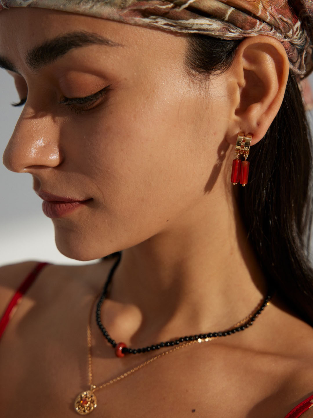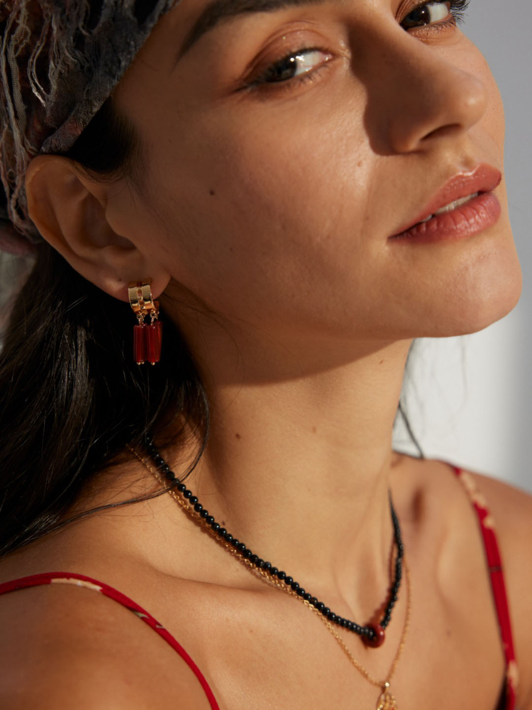 - Features three natural red agate drops on each earring