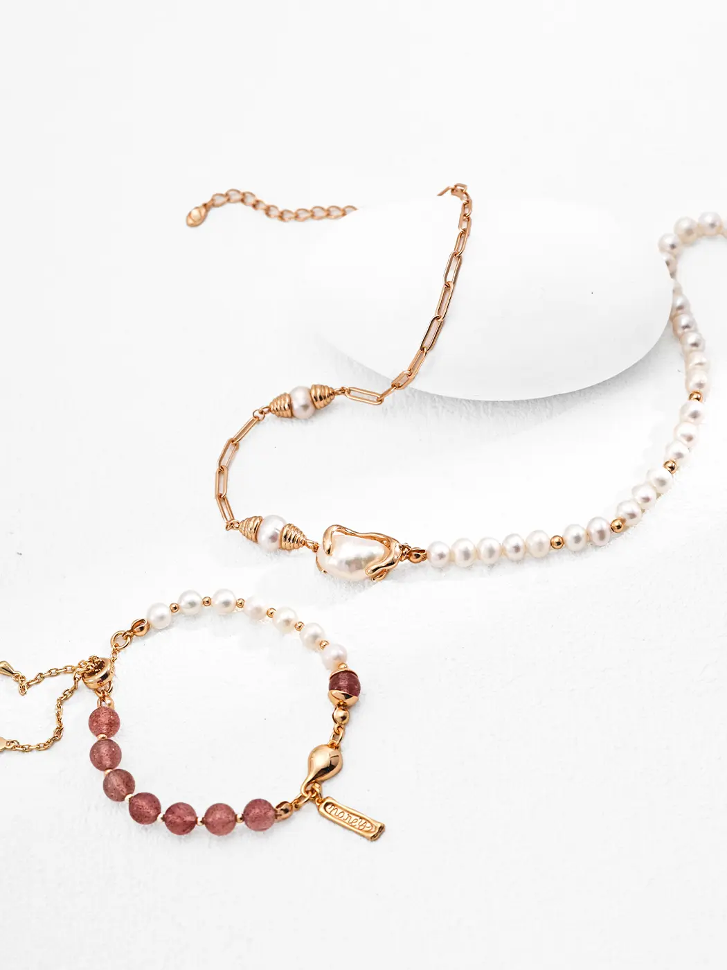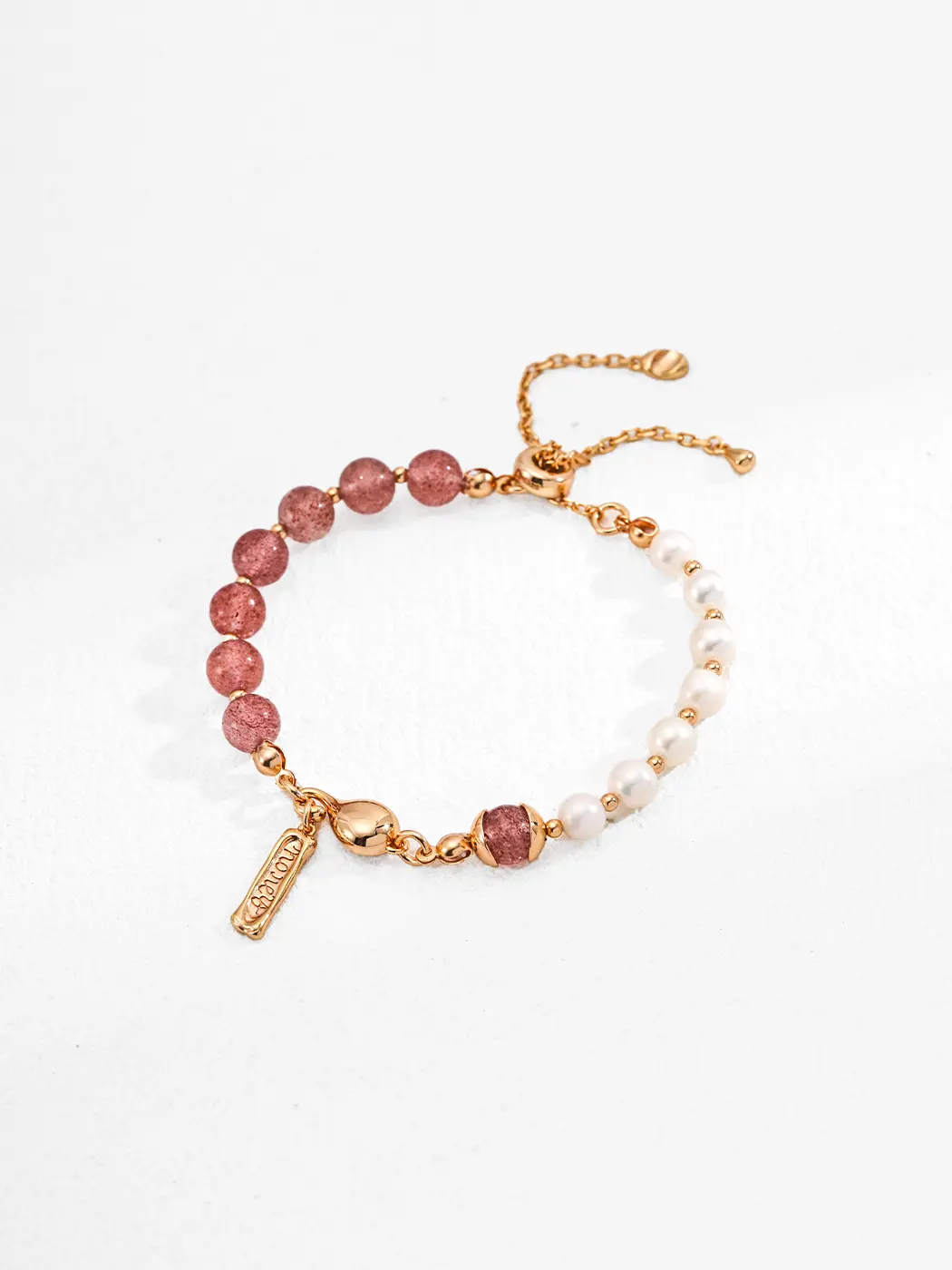 This natural pearl agate gemstone bracelet blends luminous 6 mm pearls with graceful agate and strawberry quartz beads (approximately 6–7 mm), all strung along a flexible chain measuring about 24 cm with adjustable length. Available in vintage-gold or classic silver tones, it adds subtle sparkle and elegant texture.