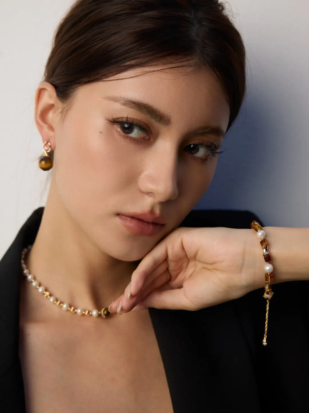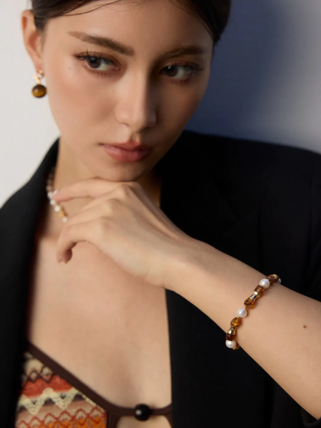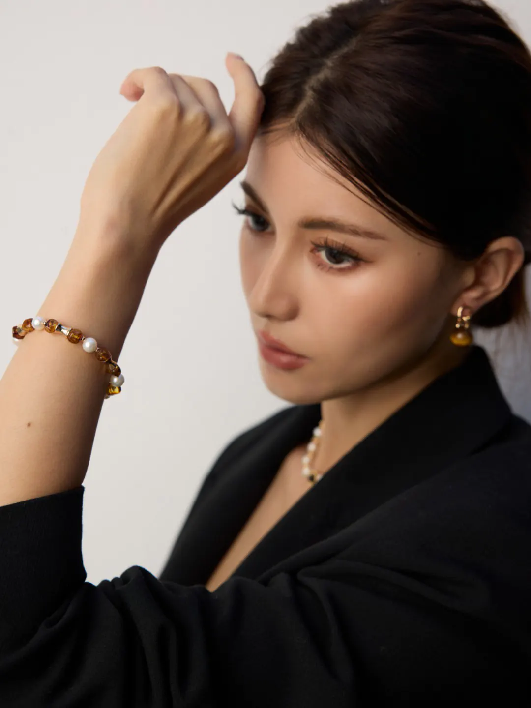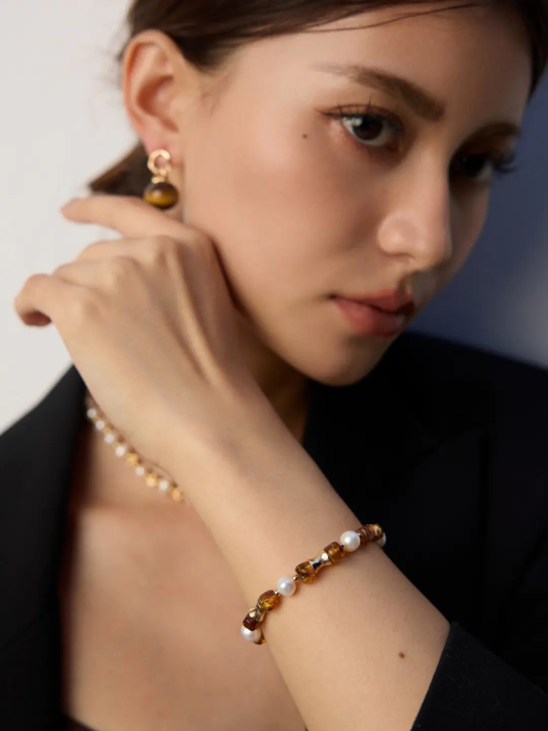 • Features natural pearls and amber beads in refined balance