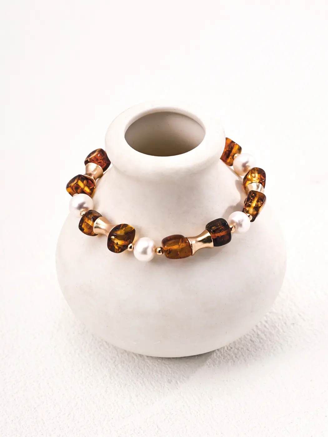 Crafted from high-quality S925 sterling silver with a durable vintage-gold finish, this bracelet highlights the natural beauty of its gemstones. Pearls deliver a radiant sheen that never goes out of style, while amber brings an earthy warmth and distinctive glow. The combination of these elements reflects both refined craftsmanship and the allure of nature, making the pearl amber bracelet a versatile and elegant piece.