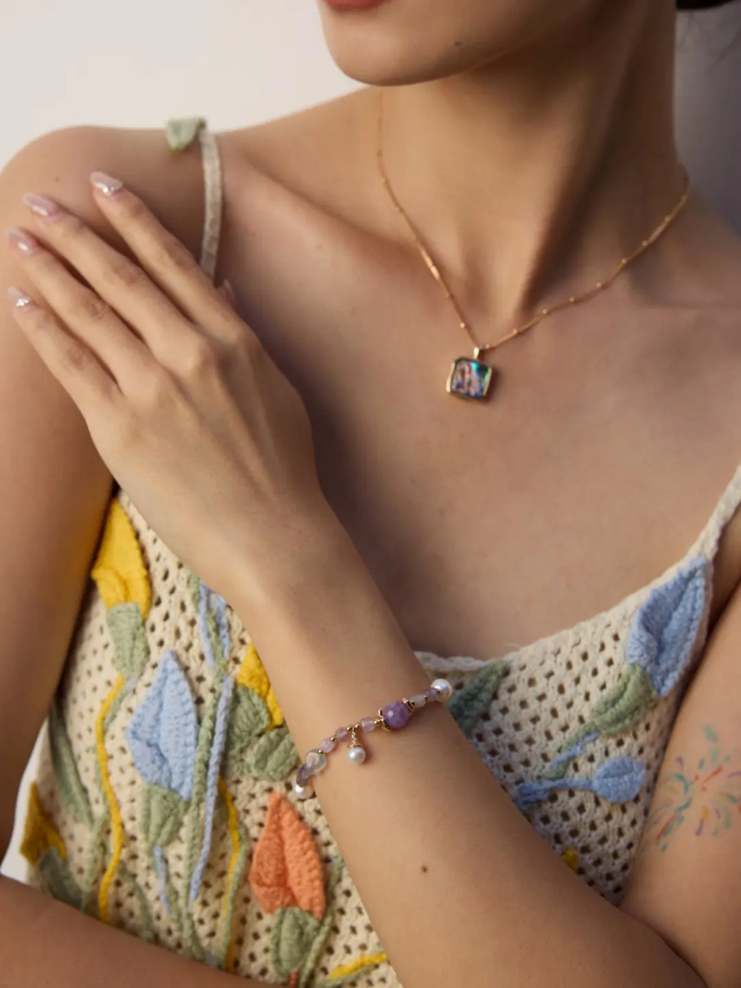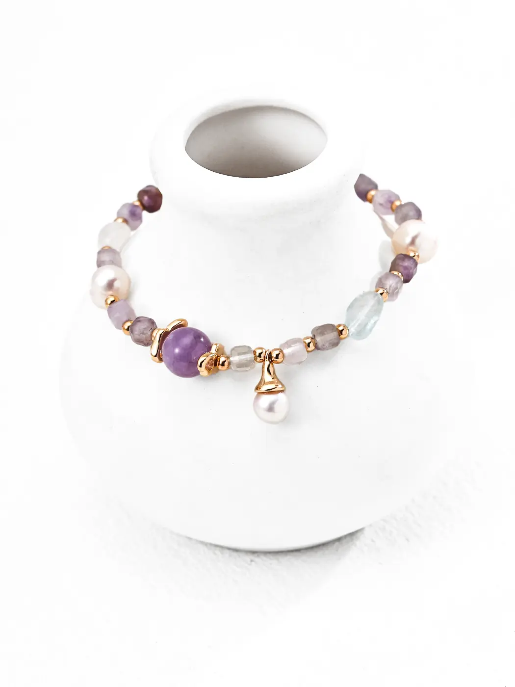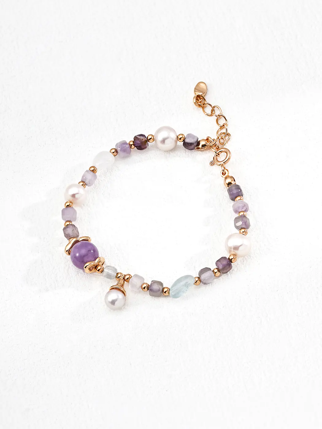 Handcrafted from premium S925 sterling silver with durable vintage-gold plating, this bracelet combines elegance and strength. Smooth freshwater pearls highlight natural luster, amethyst shines with its regal purple tone, and aquamarine crystals reflect cool, serene clarity. Together, these gemstones create a refined blend of beauty and vitality.